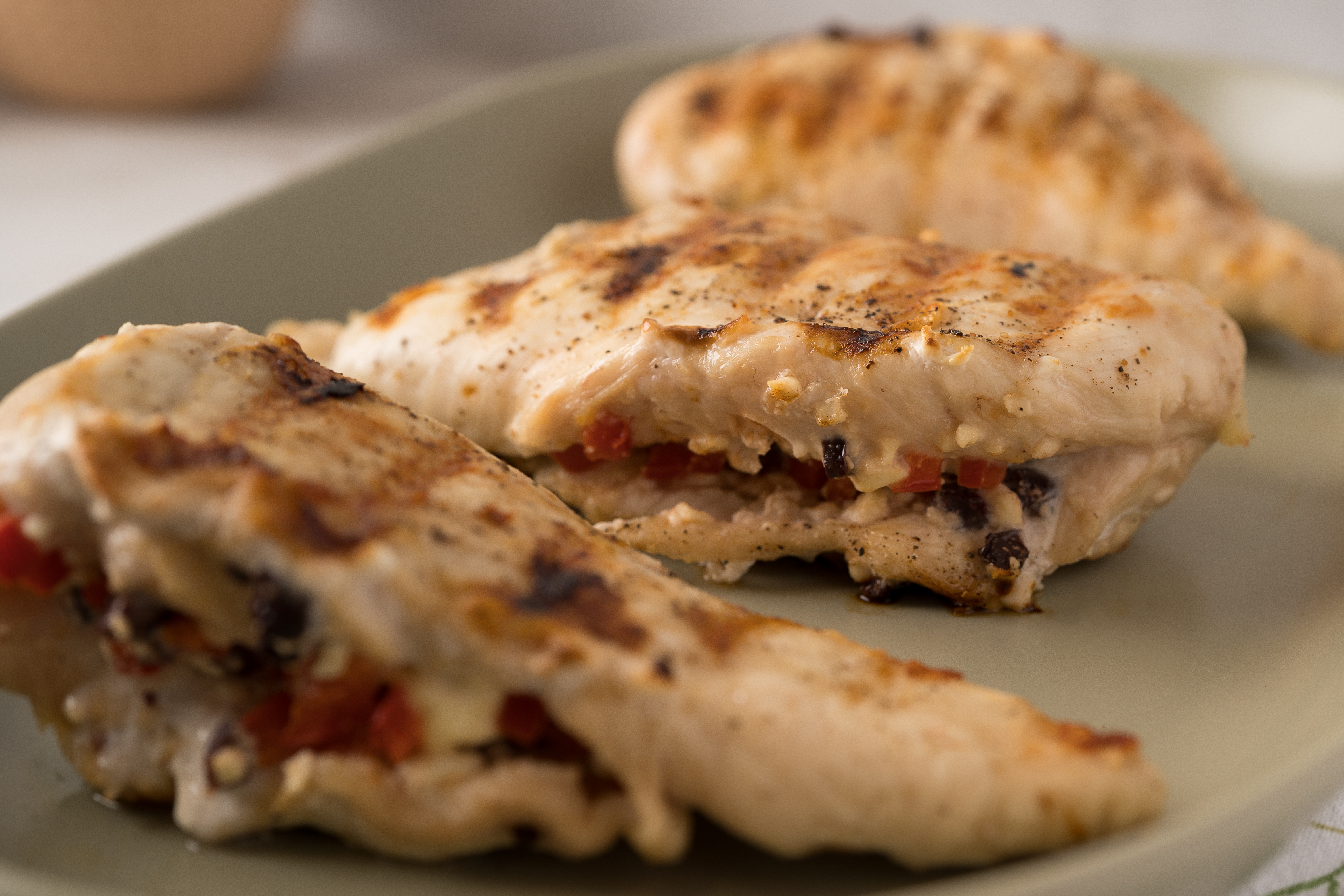 Elegant and easy: two words you like to hear when making a special dinner for those you love. Stuffed Mediterranean Chicken is easy to make and is certainly stuffed full of love! Plump, juicy chicken breasts stuffed with a tasty feta cheese, kalamata olives, red bell pepper, and basil filling all combine to take grilled chicken to new heights. The next time you need a little something special added to the menu, this Stuffed Mediterranean Chicken is definitely a good pick! Everyone will rave about it!