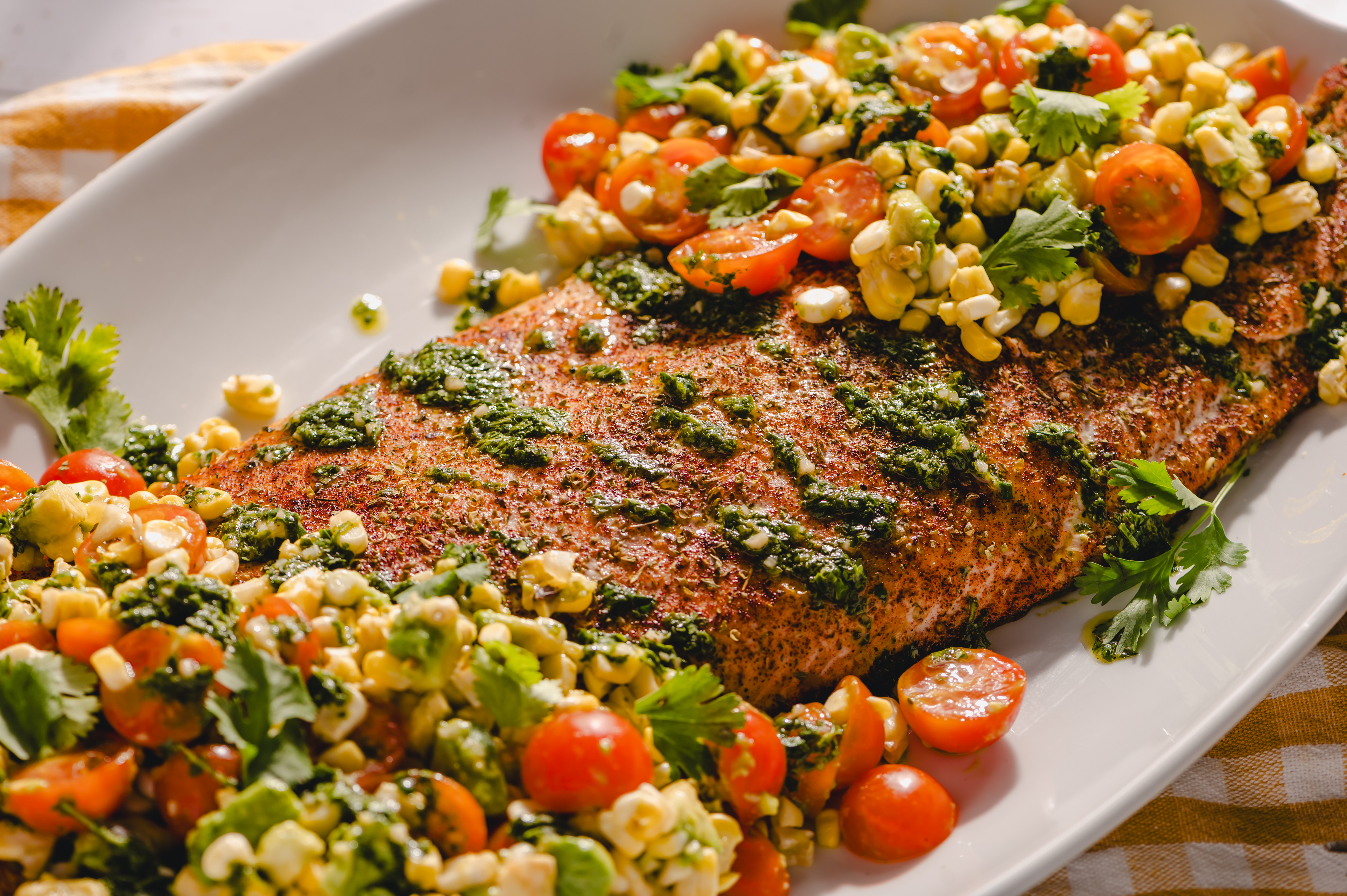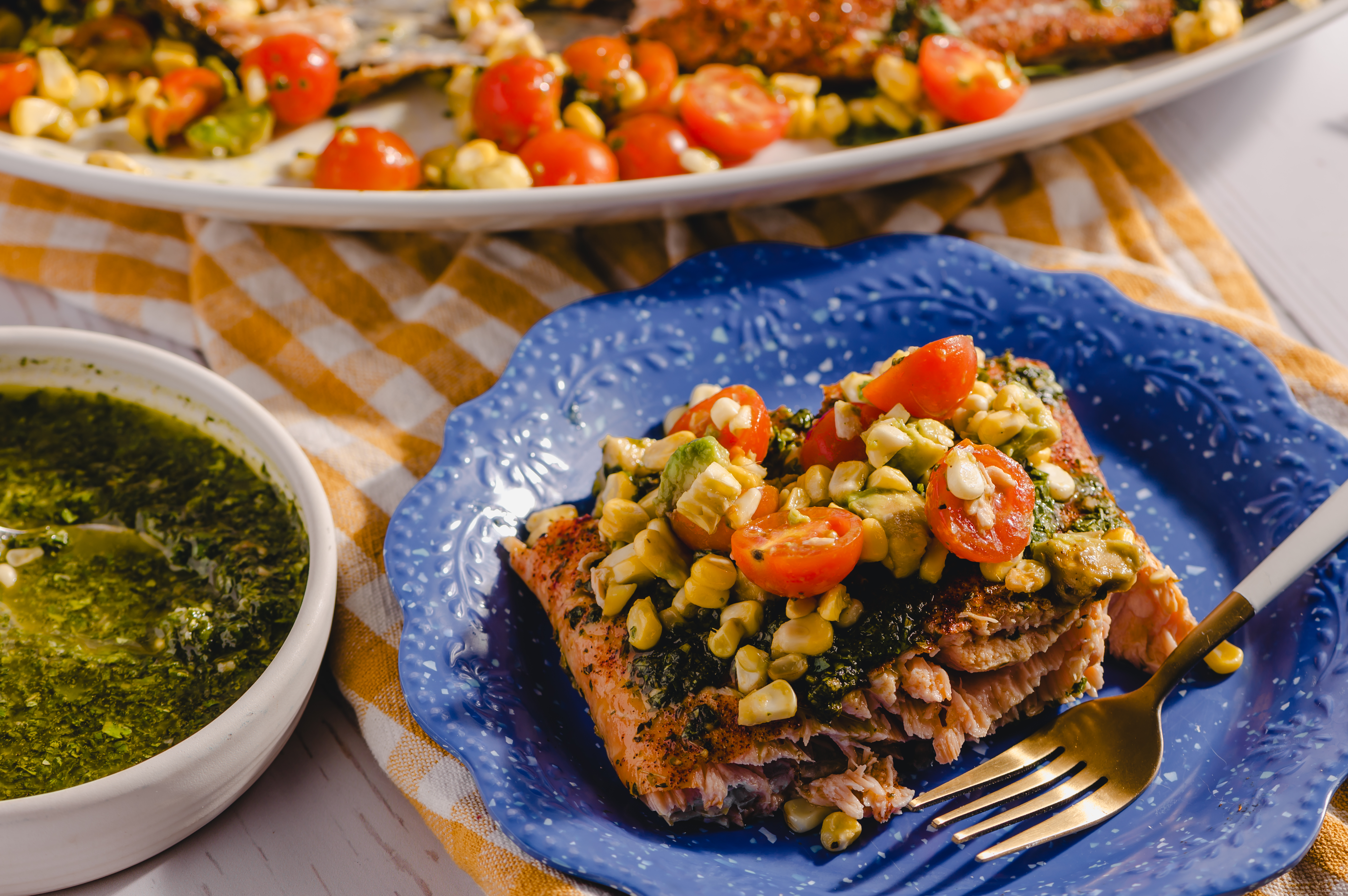 Summer Salmon is here, fresh from the sea to bring a blessing of seasonal goodness to your taste buds! The salmon is of course wonderful all on its own, with its natural succulence pairing fantastically with the delicate seasonings. But then Summer Salmon goes beyond that, whipping up a fresh, herbaceous chimichurri and a refreshingly sweet and vibrant summer salad. When you get all three components in the same bite, it's like the promise of everlasting summer indeed!