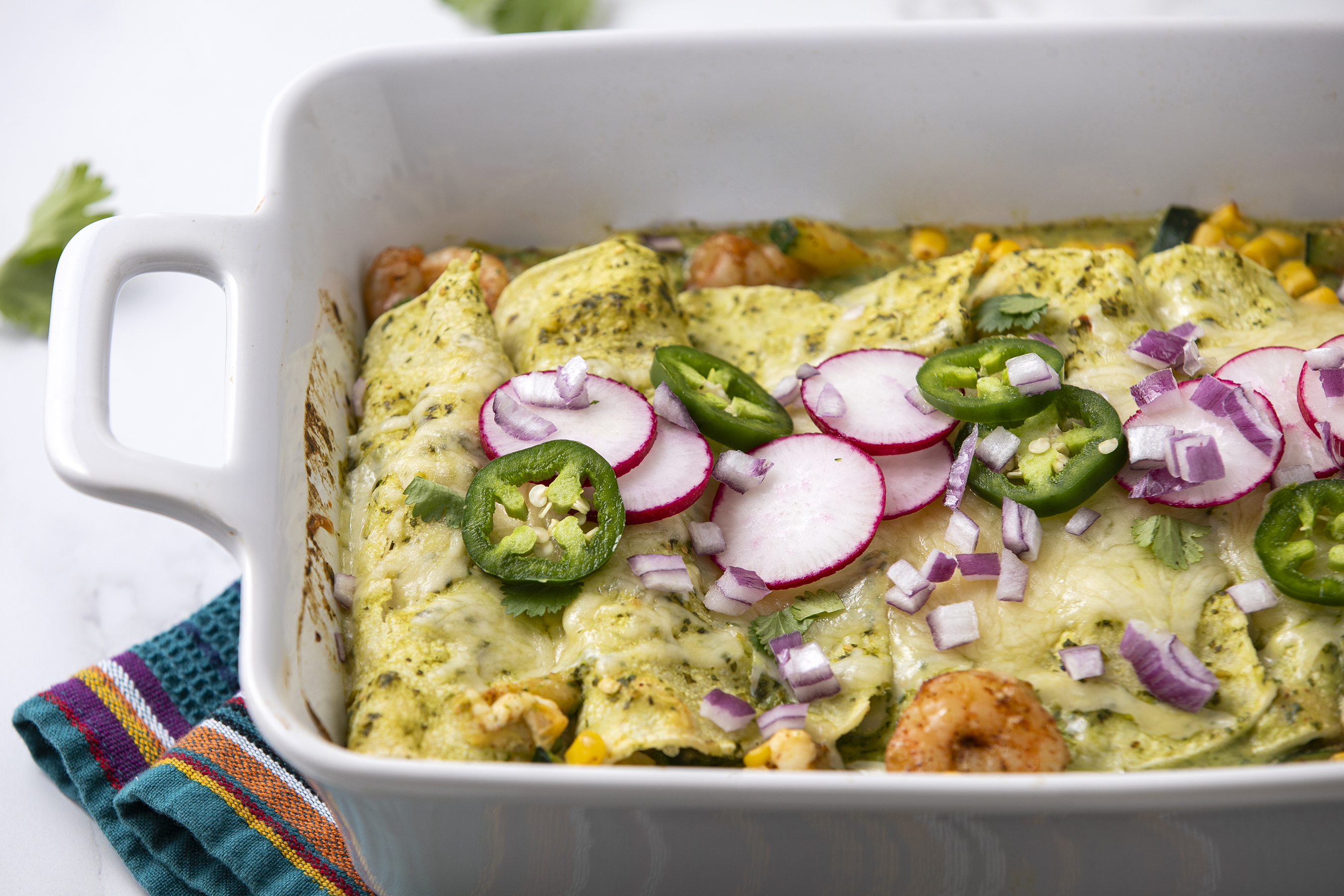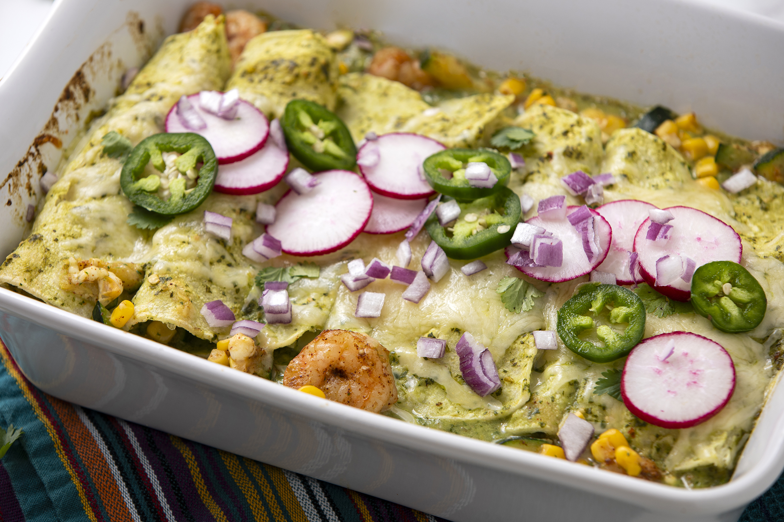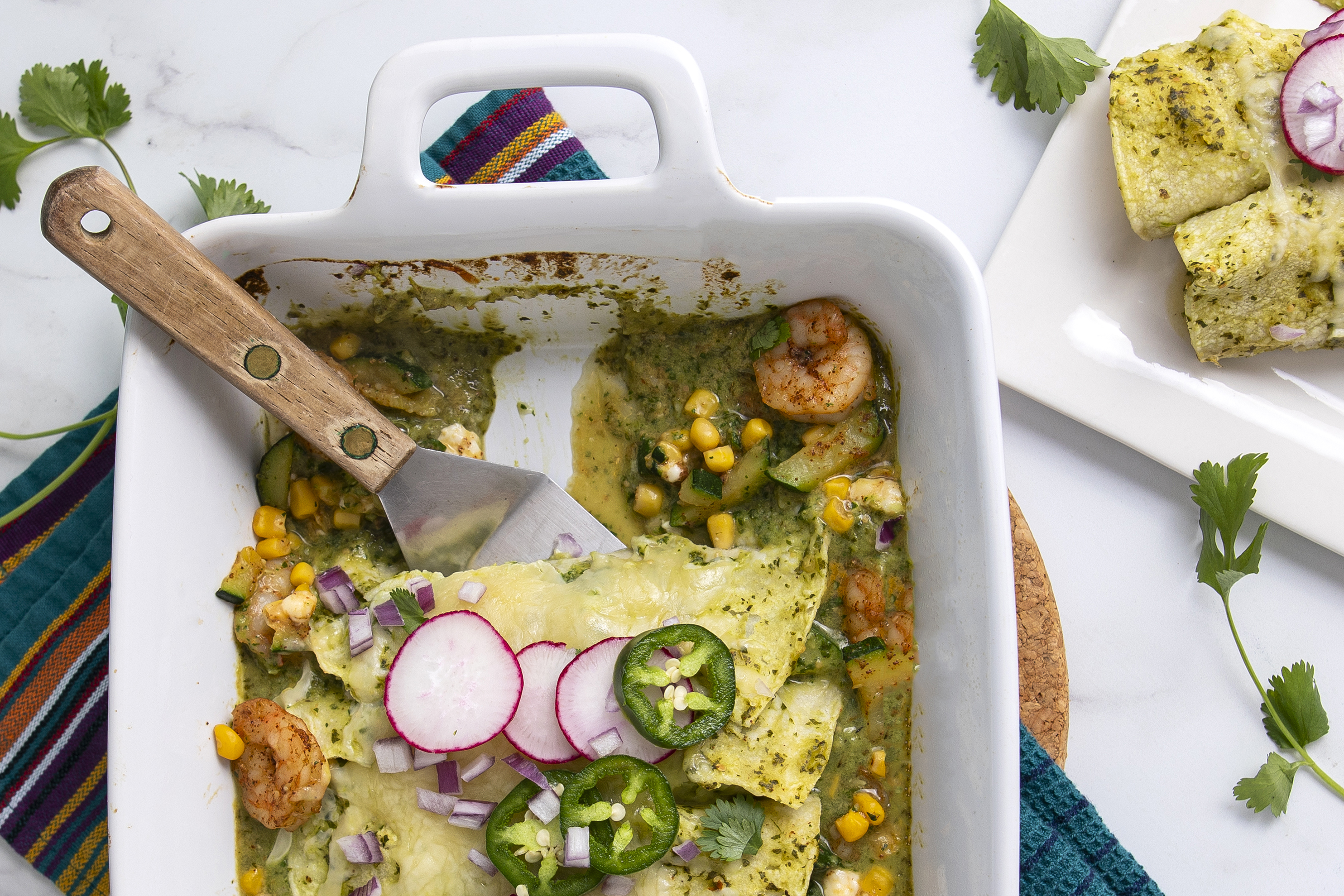 Homemade enchilada sauce! Spicy, zesty, sweet-and-savory shrimp and zucchini! Summer Shrimp Enchiladas have it all! Yes, even salty cotija cheese and melty Monterey Jack cheese! Topped the way you love your enchiladas; Summer Shrimp Enchiladas are just right for an evening relaxing after a great summer day!
