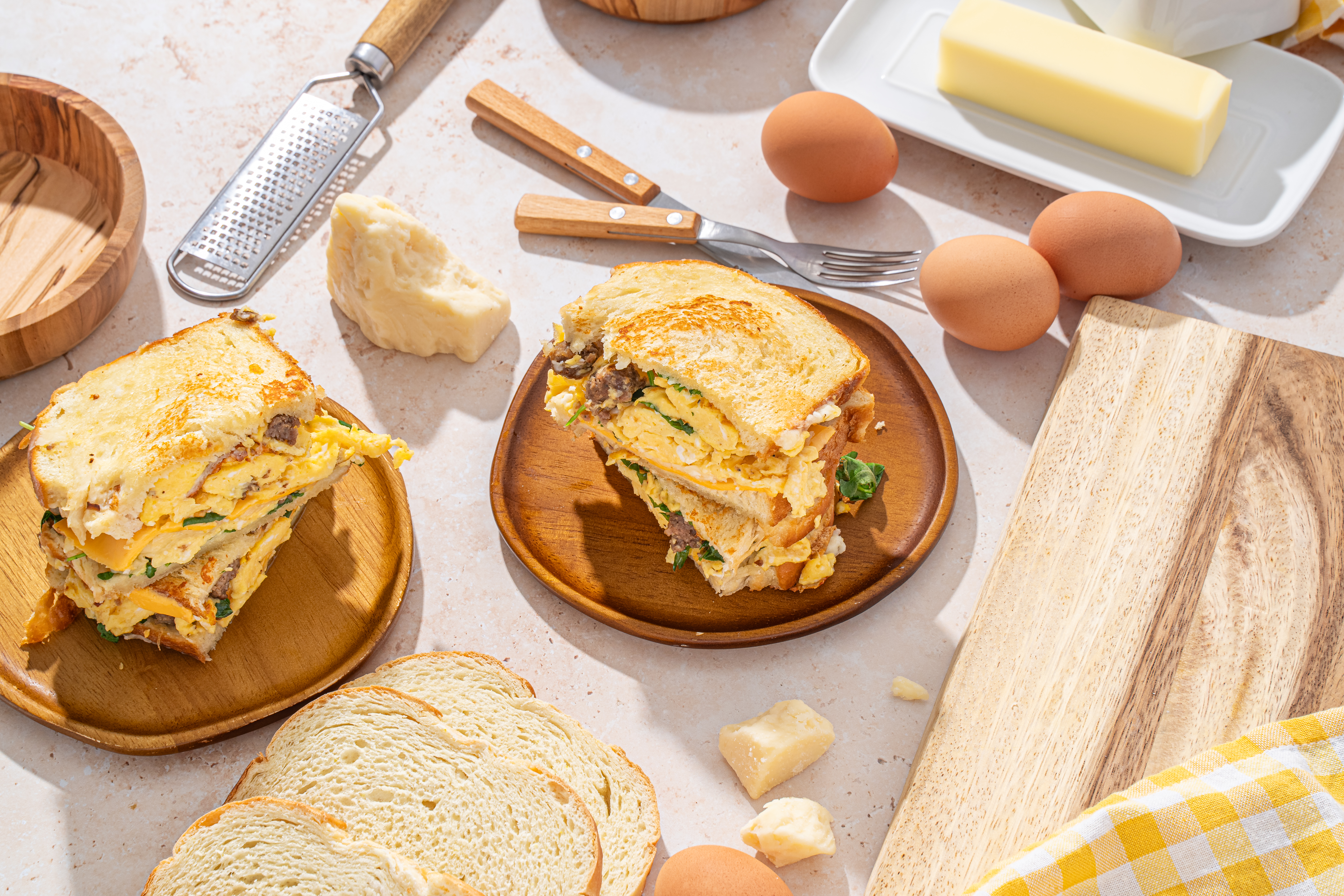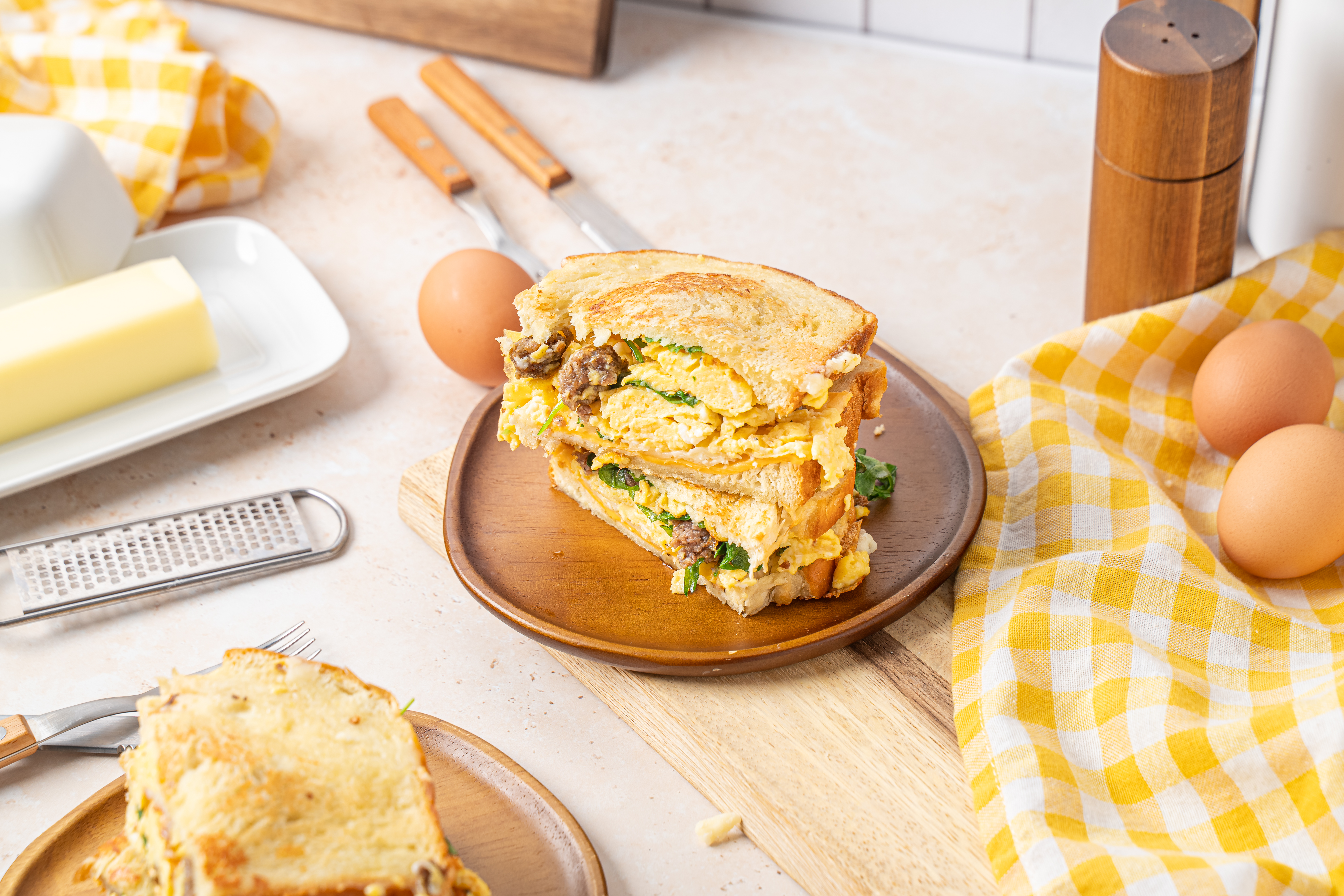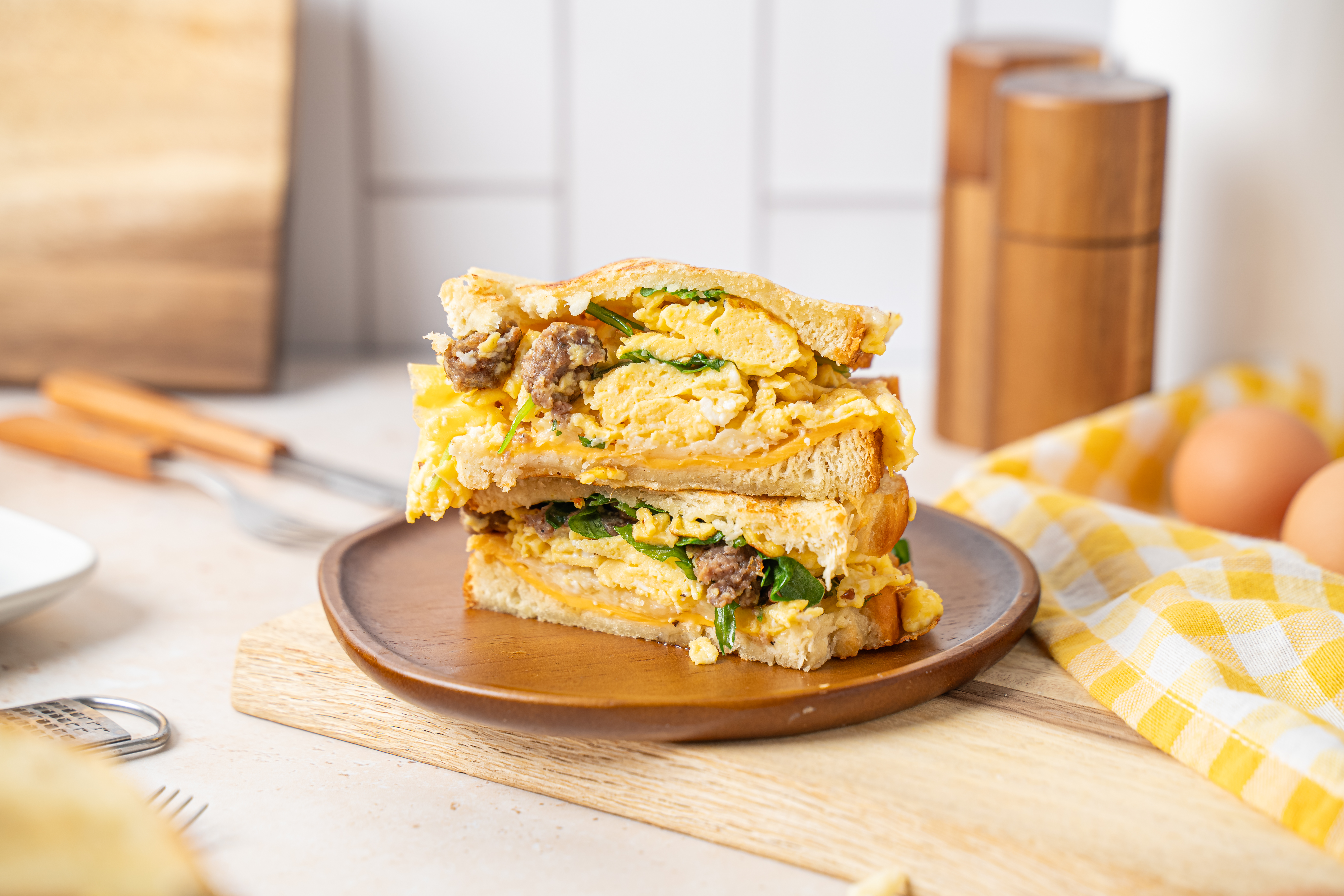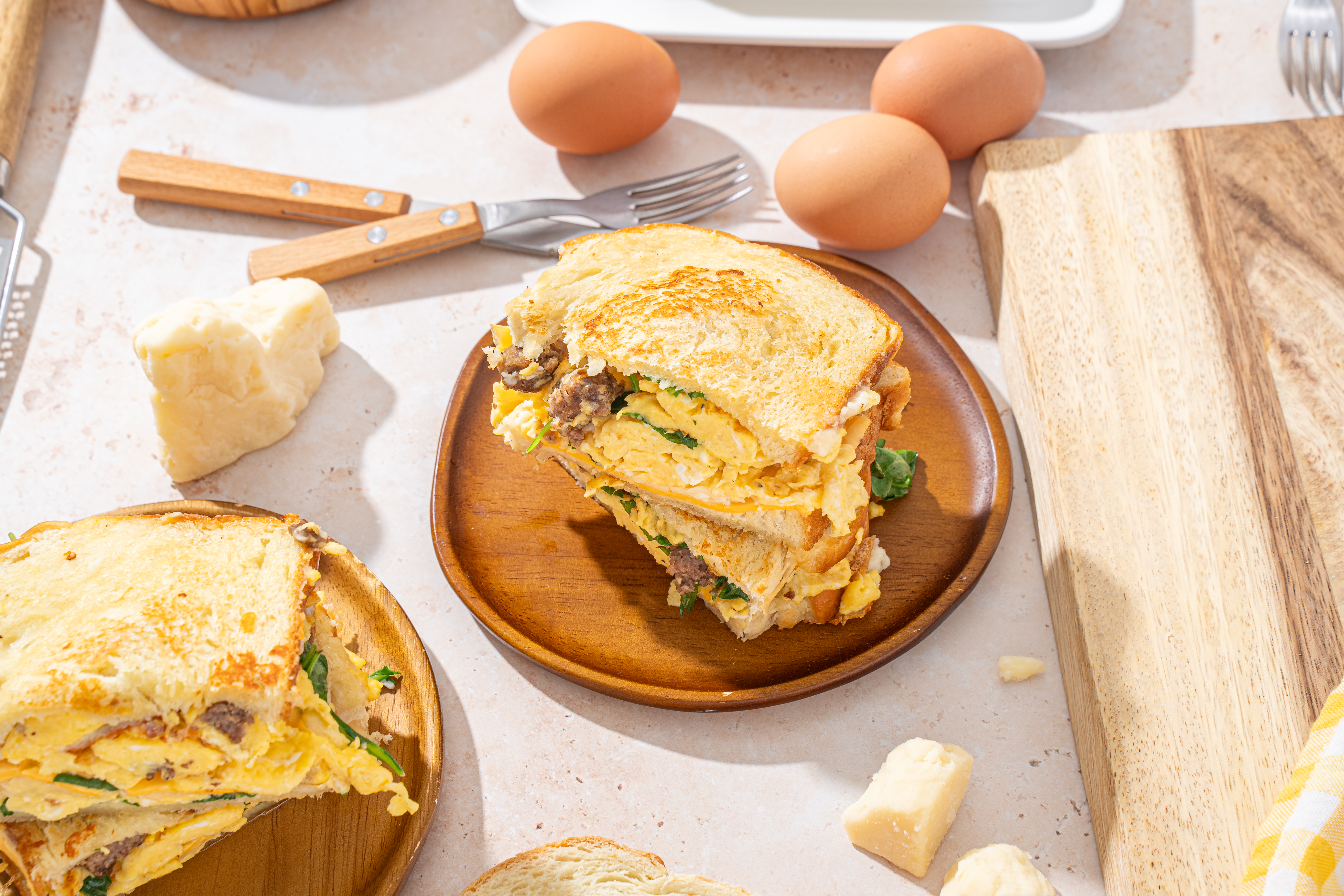 It's a new day and a new way to look at breakfast! Sunrise Grilled Cheese takes you back to your childhood in a more adult-like way! Loaded with sausage crumbles and a fluffy egg scramble that's melted together with a trio of cheeses, these sourdough-hugged handhelds are lathered up with some beautiful butter and then grilled to golden-brown. Oh, and there's a little bit of spinach thrown in there for good, healthy measure. Don't waste another day without trying the Sunrise Grilled Cheese. It's sure to melt your heart and your hunger!