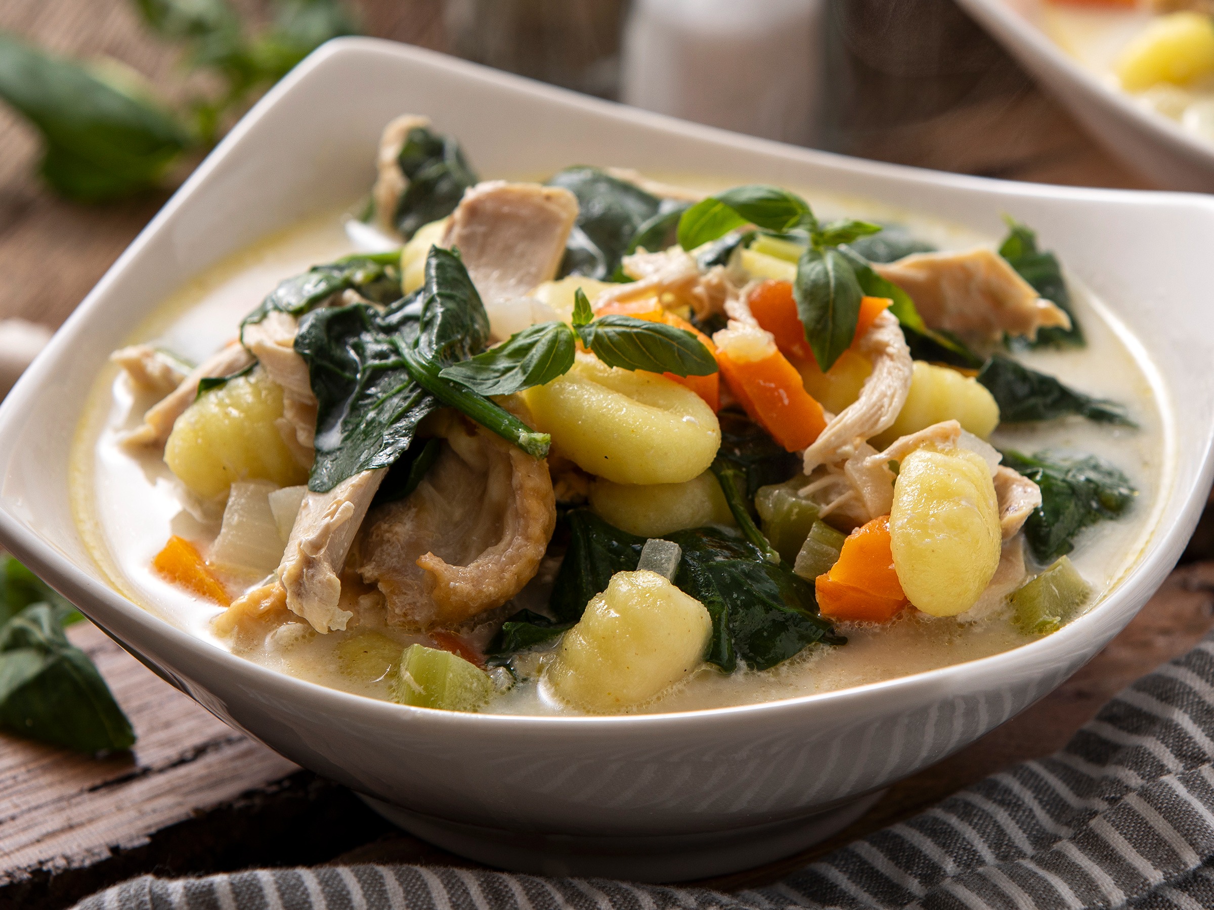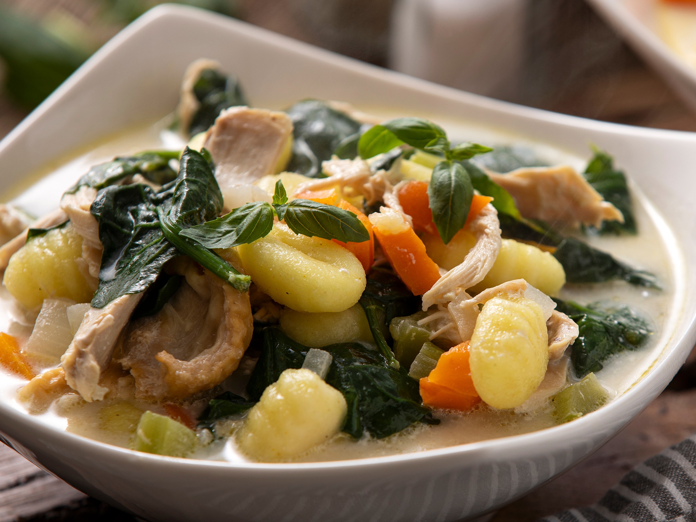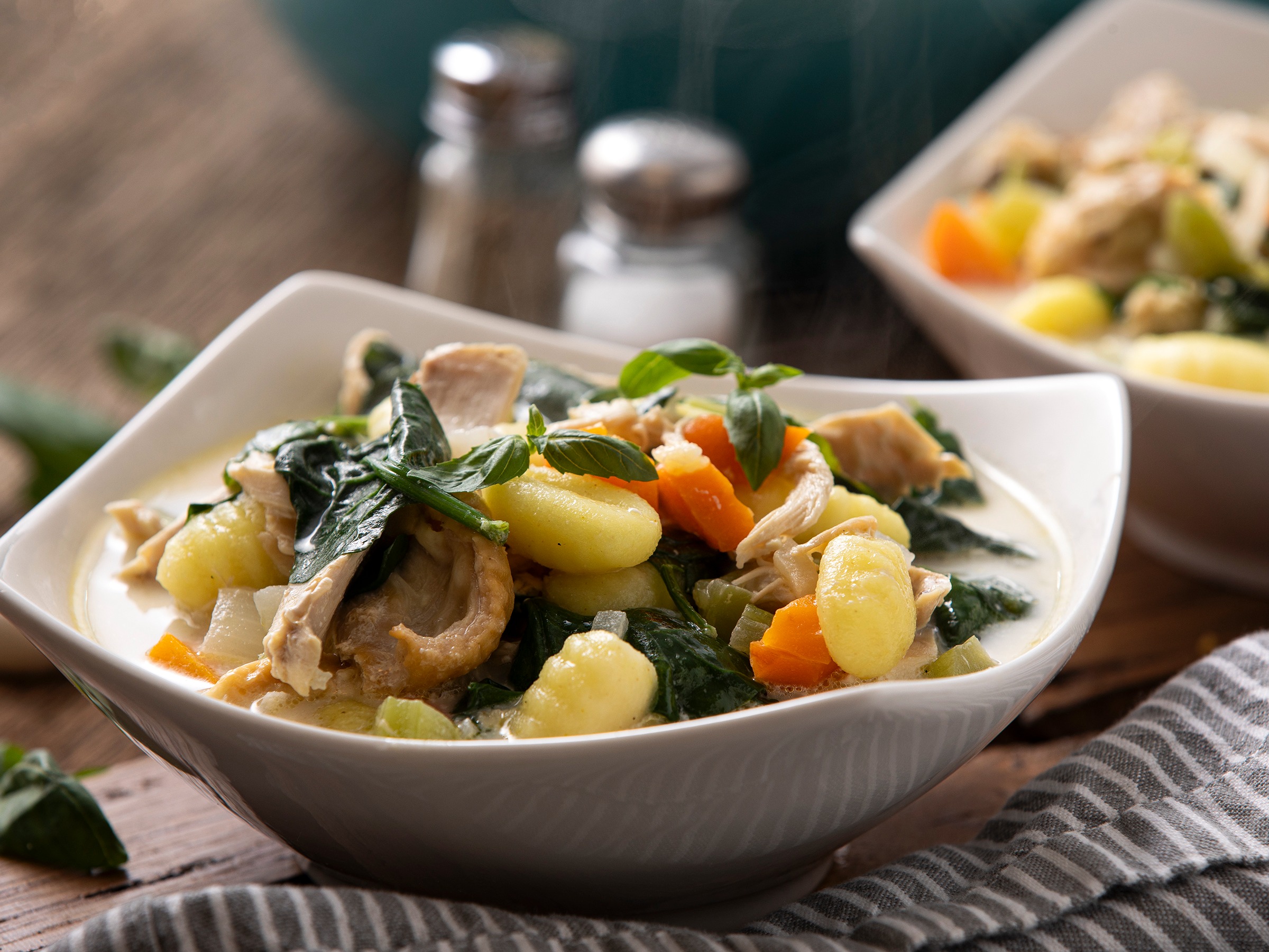 The Floating Chicken... it's quite a name, right? It makes us laugh. It also makes our taste buds water, because we know what it entails! There's nothing quite like this savory broth loaded with tender veggies, delicious potato gnocchi, and juicy chicken, of course! All that floating together, just waiting for your spoon to scoop it all up. That's The Floating Chicken! It's hilariously delicious!