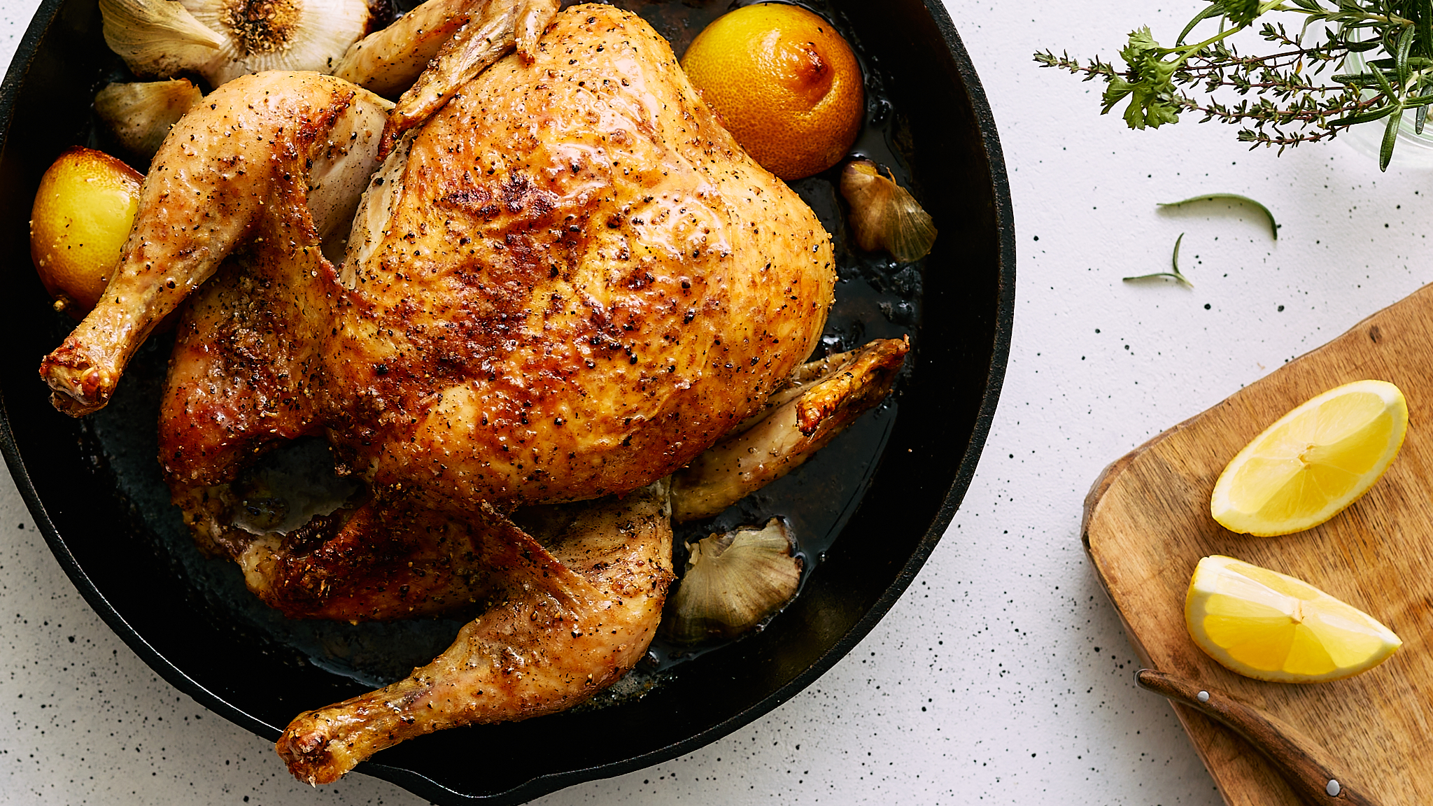 Step 5 -In a large, oven-safe skillet, add the seasoned chicken, breast-side up and cut-side down, and arrange the lemon halves and the garlic halves around it.