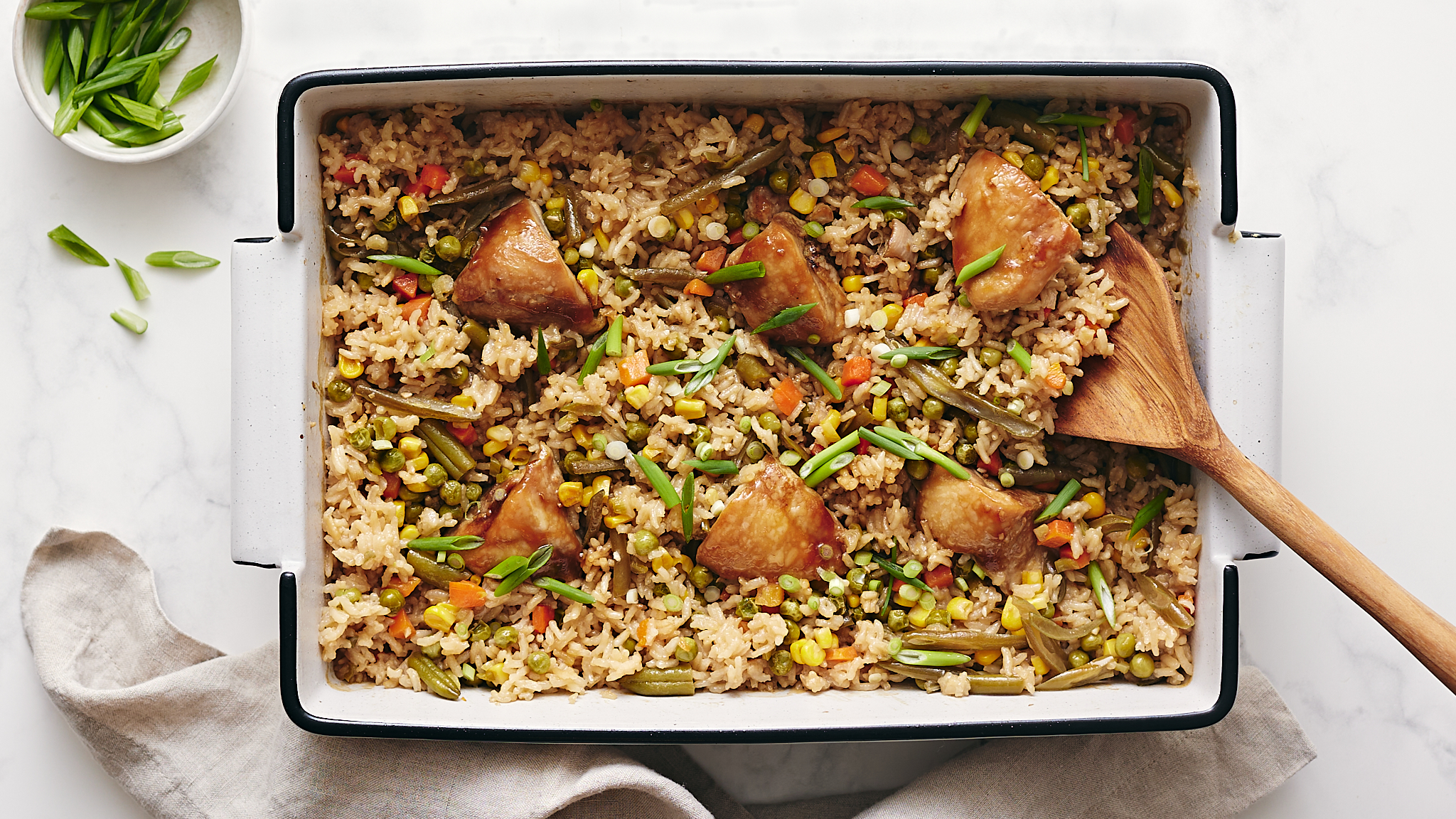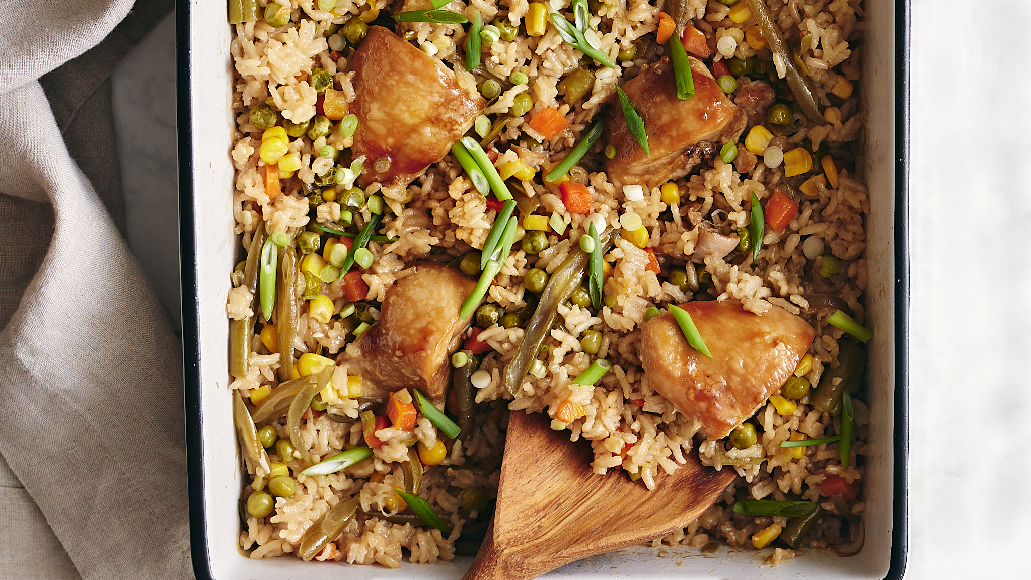 The name says it all! The Takeout Bake is the one you should turn to when you feel tempted for some Asian-inspired, picked-up cuisine. Stay at home instead and enjoy these juicy, tangy chicken thighs nestled over some deliciously seasoned rice and veggies. It's worth the extra effort for an exquisite meal made by you! Don't order out! Make The Takeout Bake instead!
