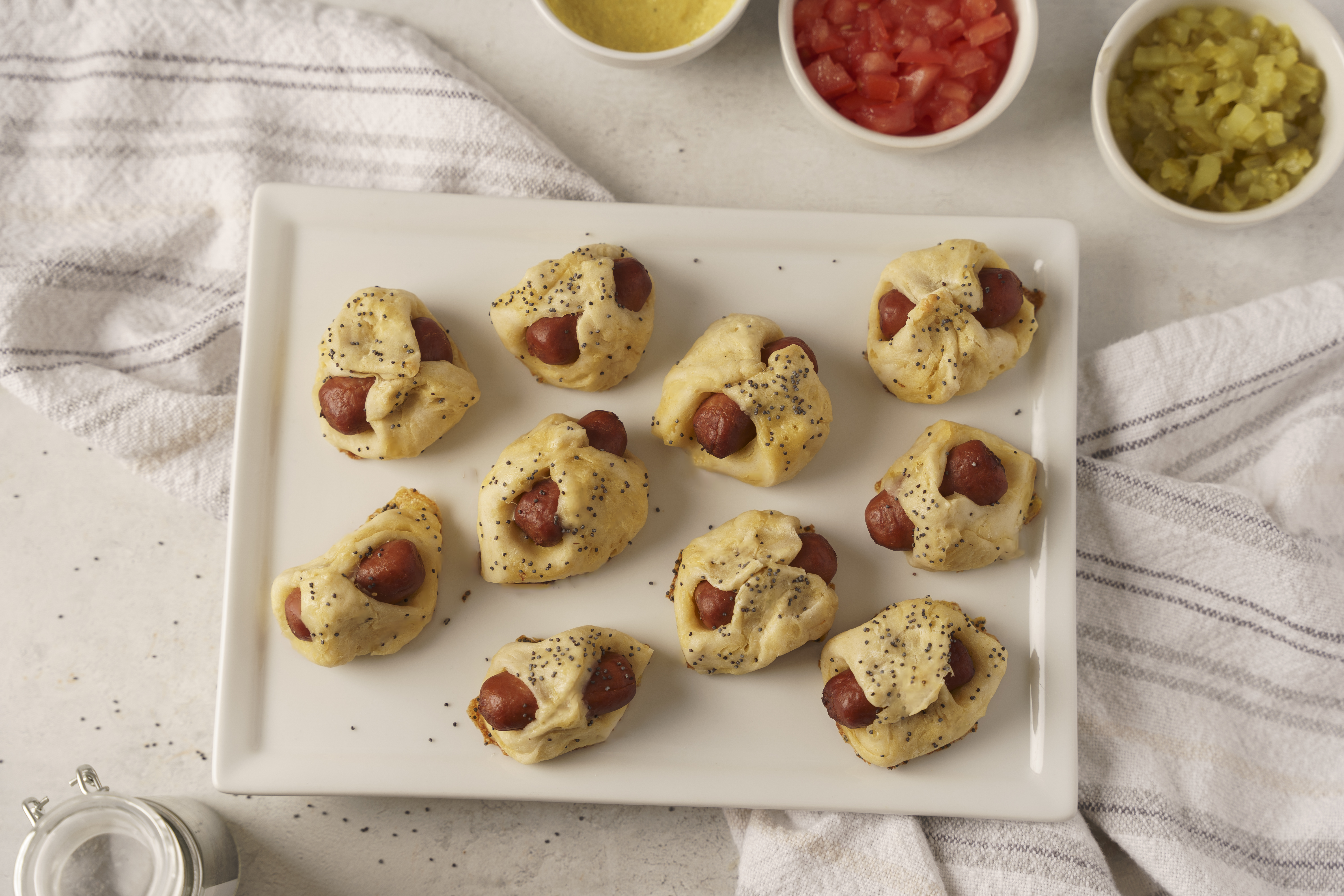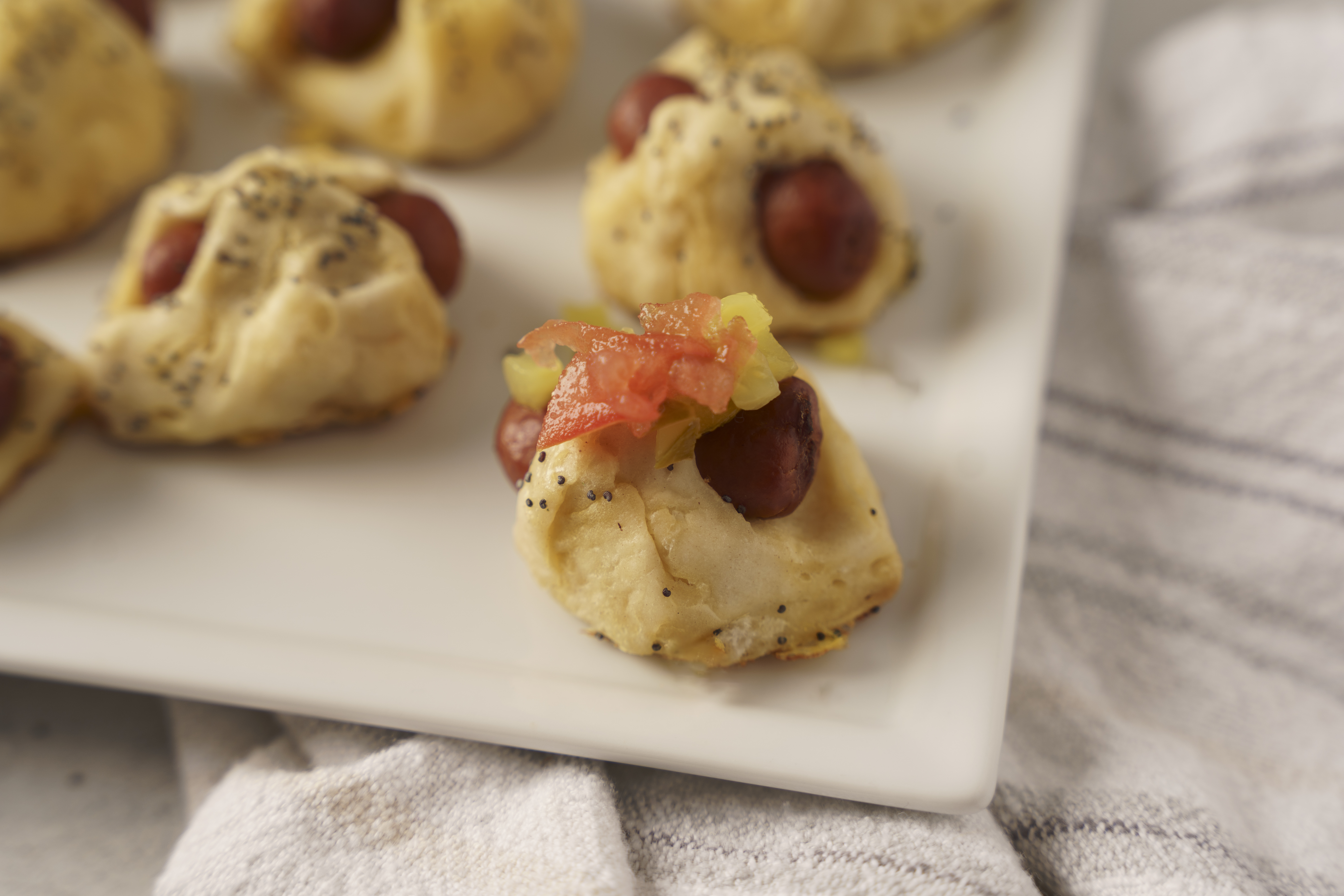 This is a snack Chicago can be proud to call its own! These Windy City Minis are homemade miniature sausage rolls, with a succulent cocktail sausage at the center wrapped in a buttery golden-brown crust and coated with a nutty poppy seed layer. A fantastic onion-mustard dipping sauce and a tomato and pickle relish help make each little bite such a flavor explosion! The Windy City Minis are the snack that feels as big as the City of Big Shoulders.