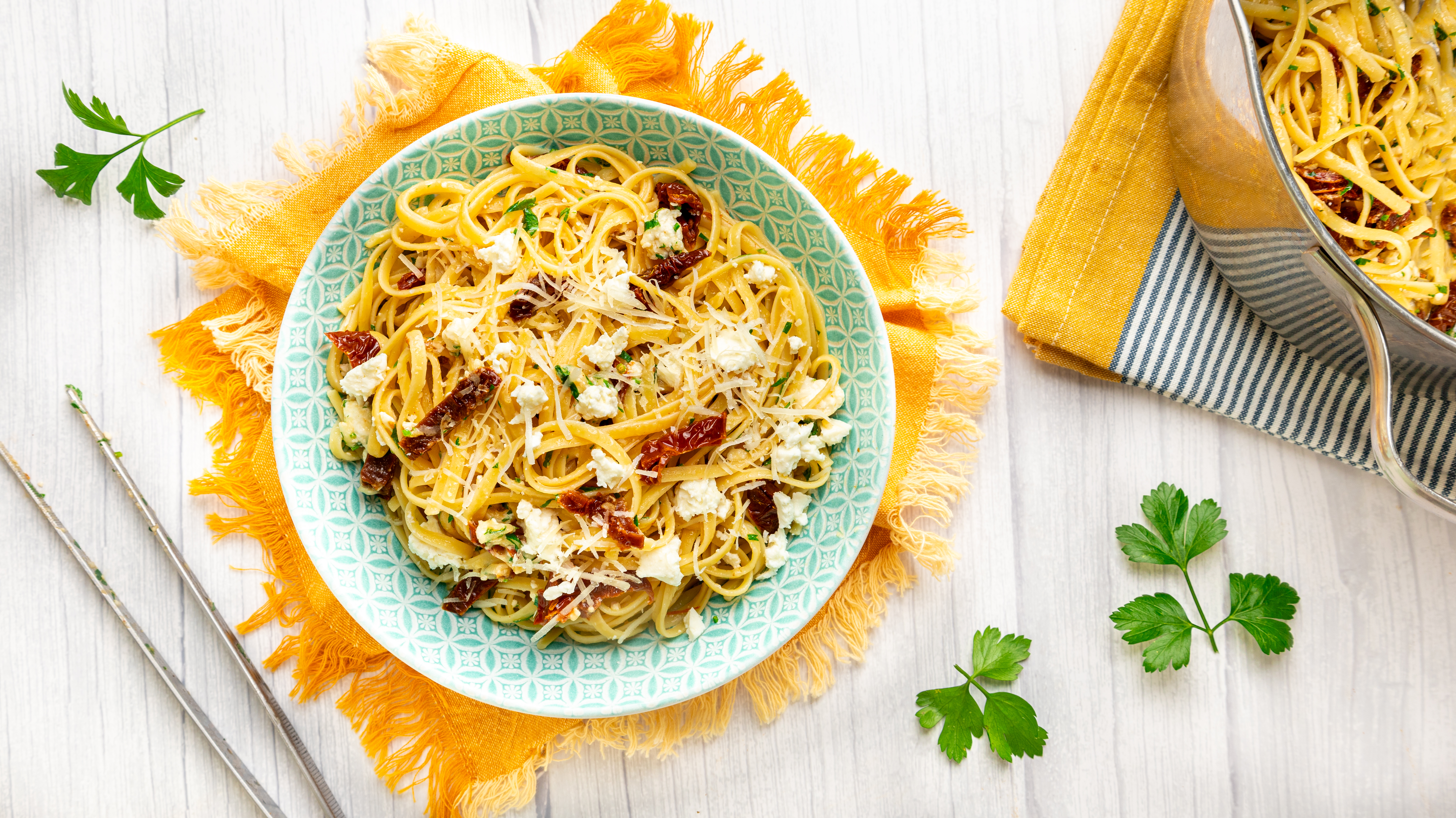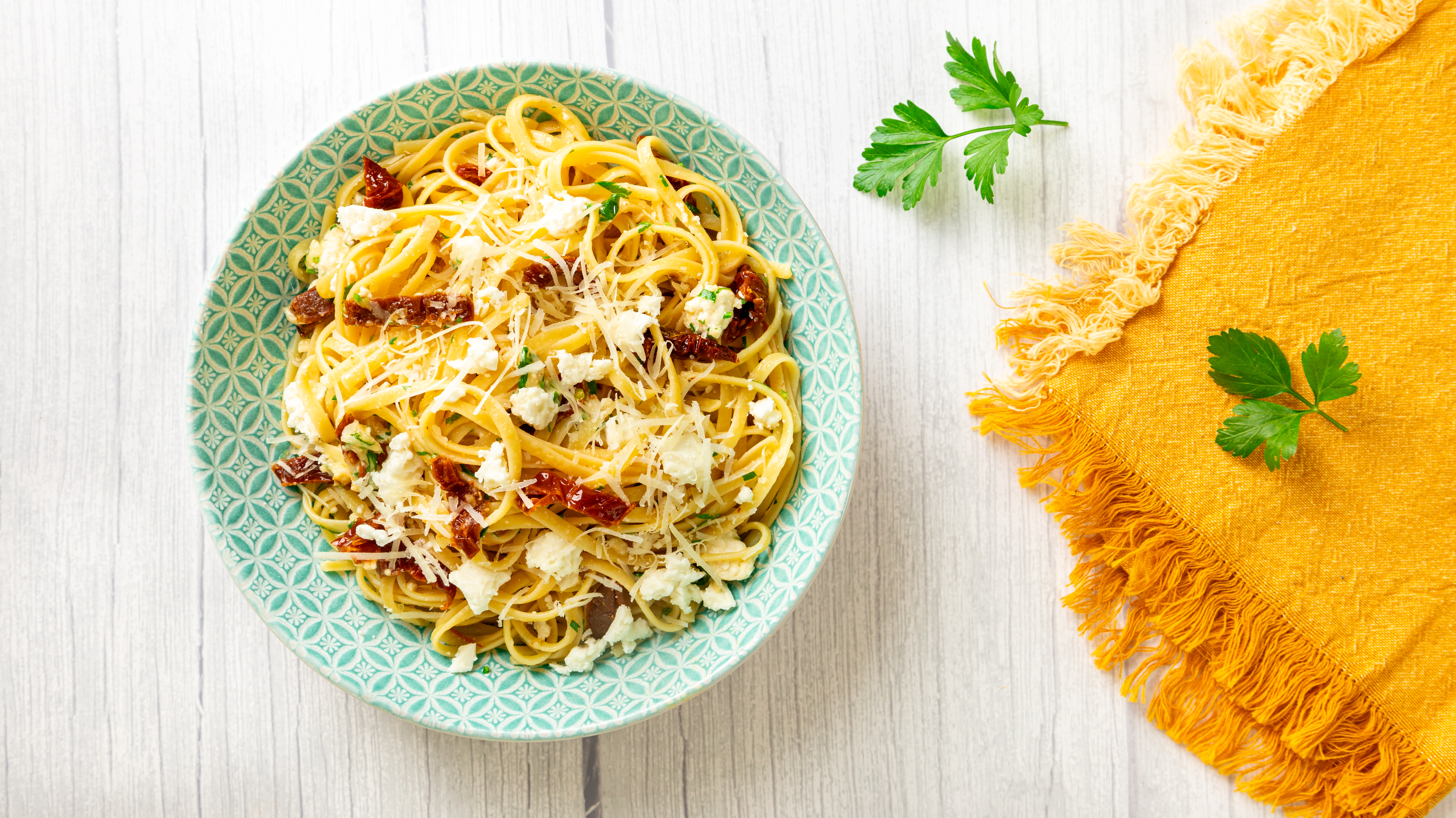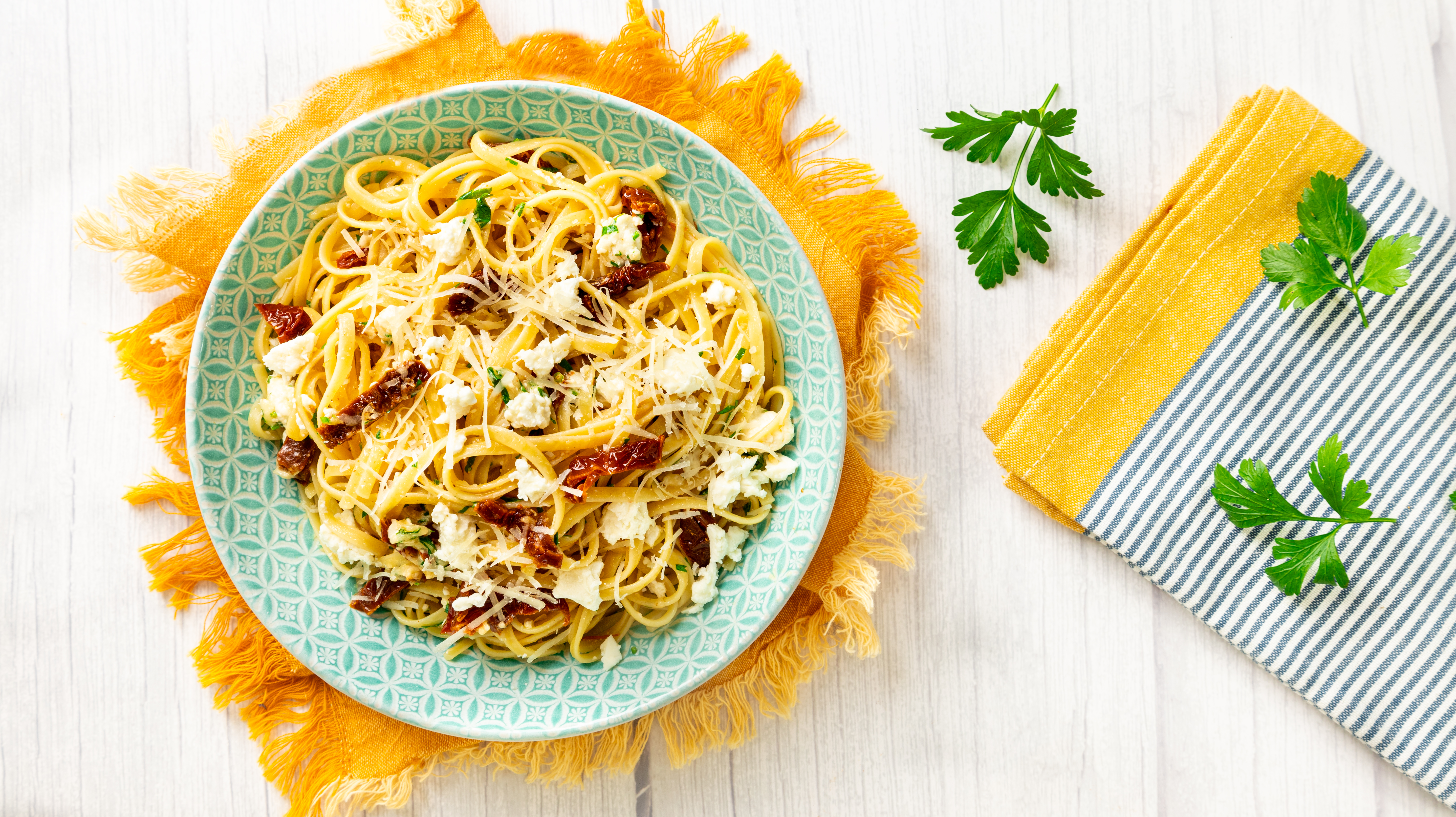 This is an absolute life-saver! If you are short on time, money, and maybe patience (ha), Time-Saver Linguine will help you in all ways and leave you feeling so satisfied! Sumptuous sun-dried tomatoes are really the star of the show here, along with the tender linguine tossed with crumbled tangy feta cheese and grated sharp parmesan cheese for a 5-star taste without the 5-star price. Time-Saver Linguine will help you get the meal on the table faster and with more flavor than you can imagine.