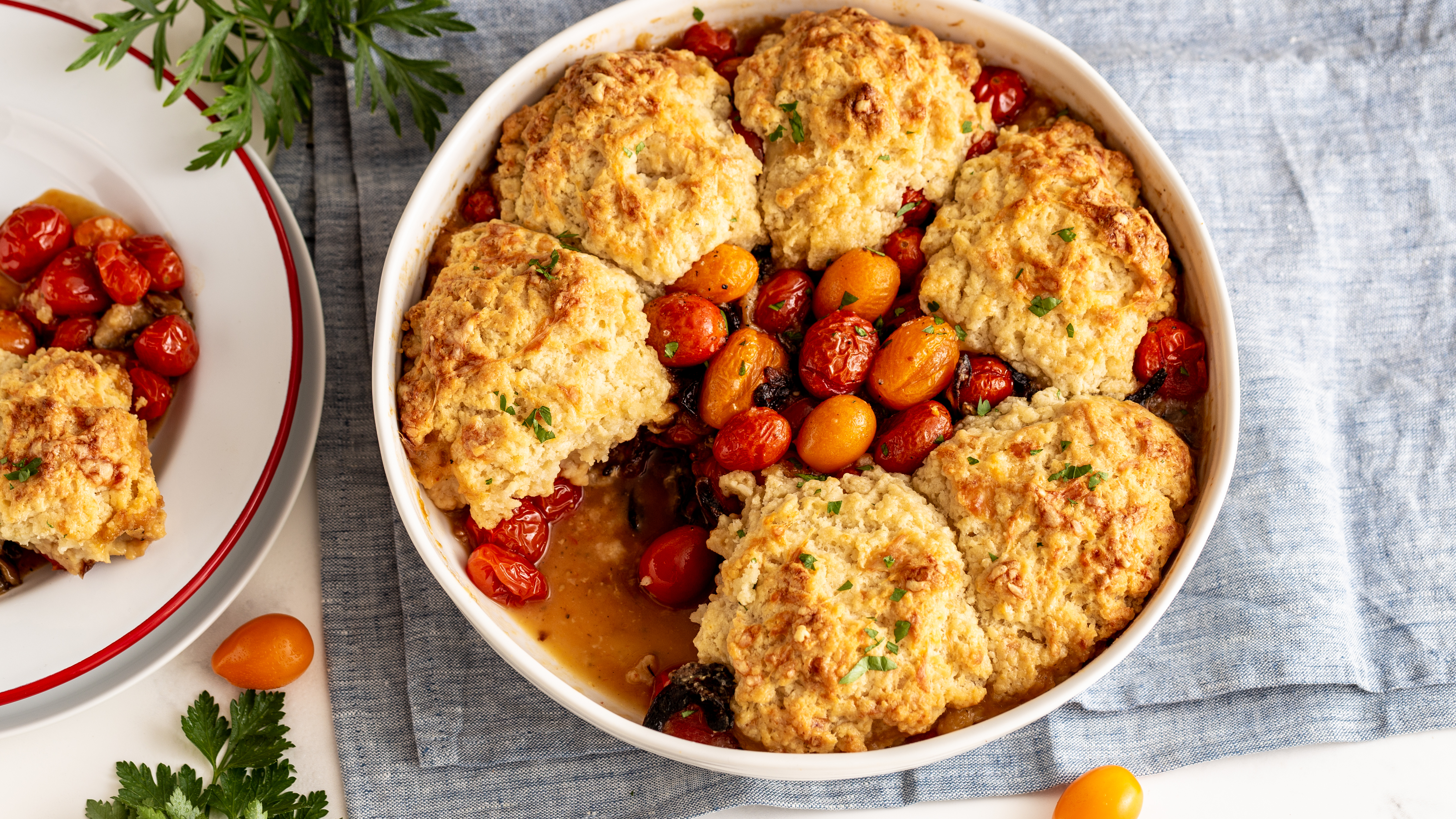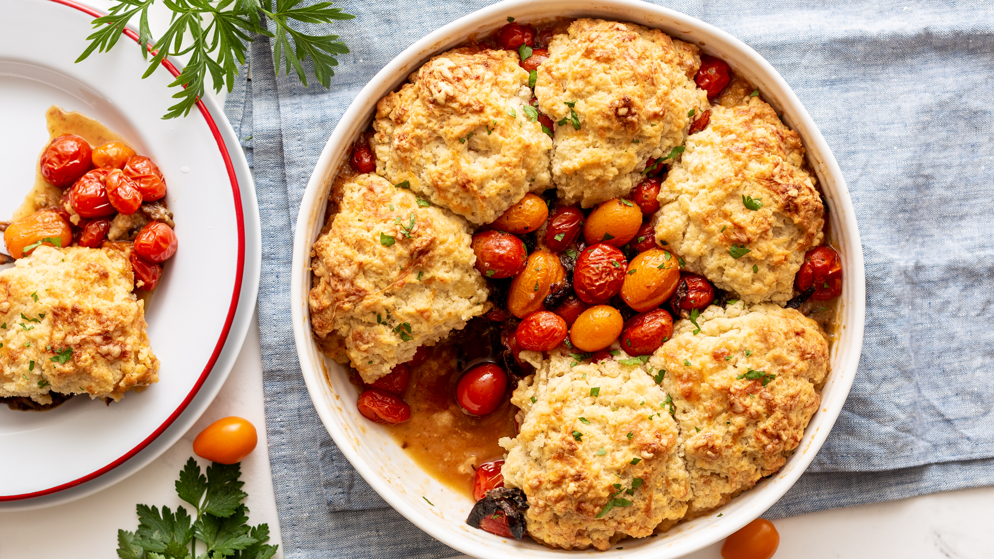 A savory cobbler really does change the game: everyone loves pie, so why not as a side dish? This Tomato Cobbler is bright and rich, with a little sweetness and a little spice for variety. Meanwhile, on top, it has a buttery, flaky, homemade biscuit topping, sprinkled with smoky cheese. Tomato Cobbler is photogenic and definitely delicious; a scrumptious side dish that will steal the show at any table!