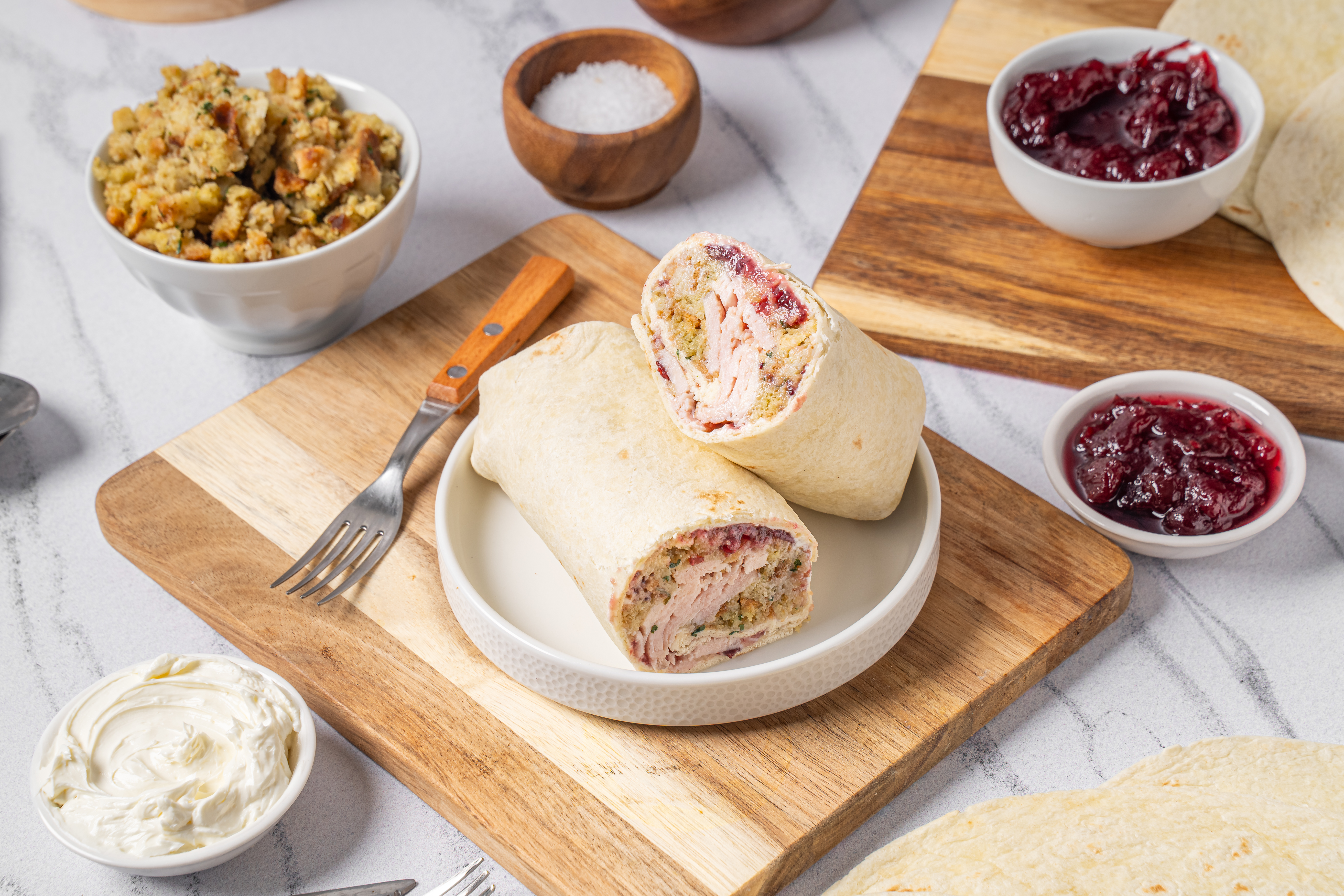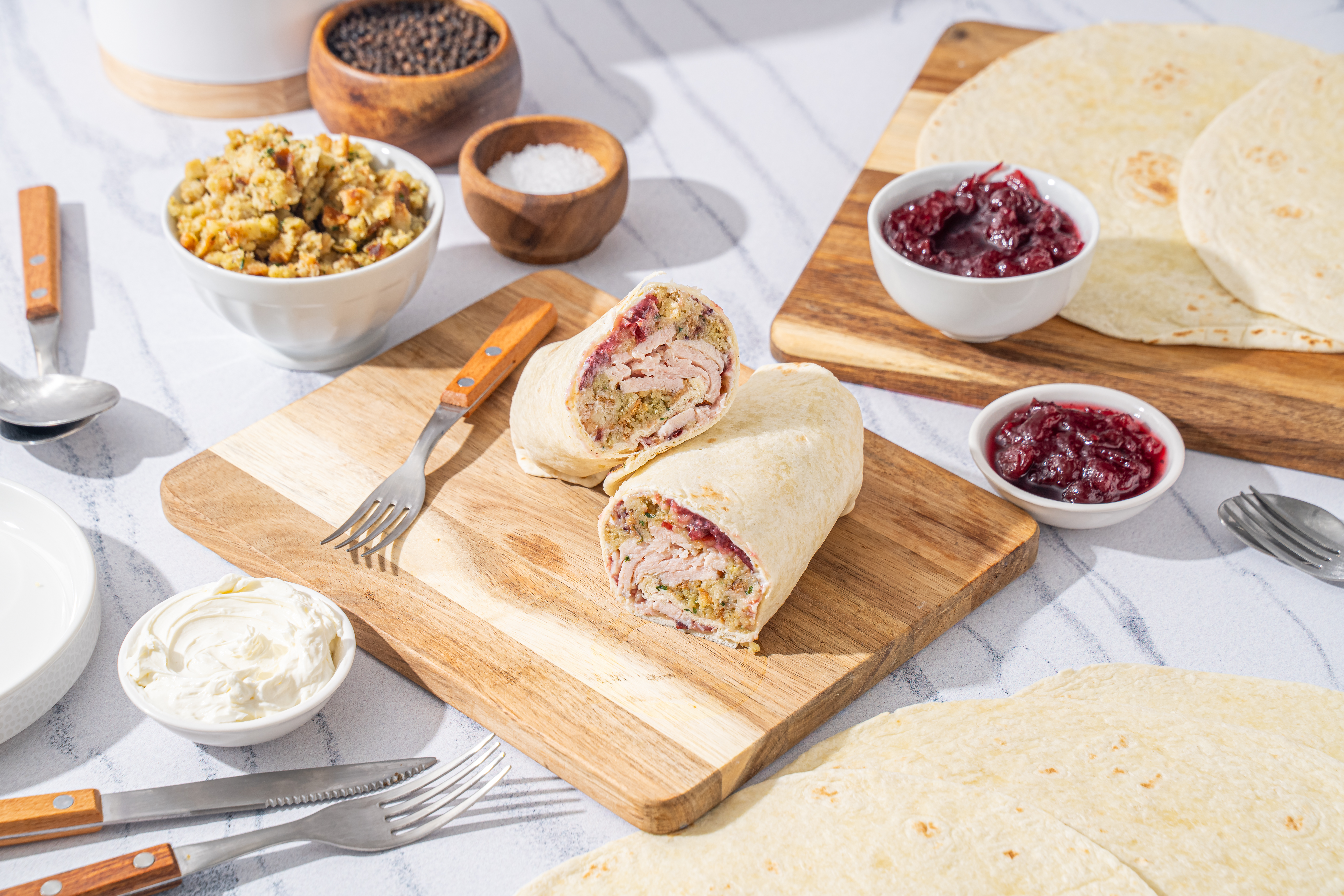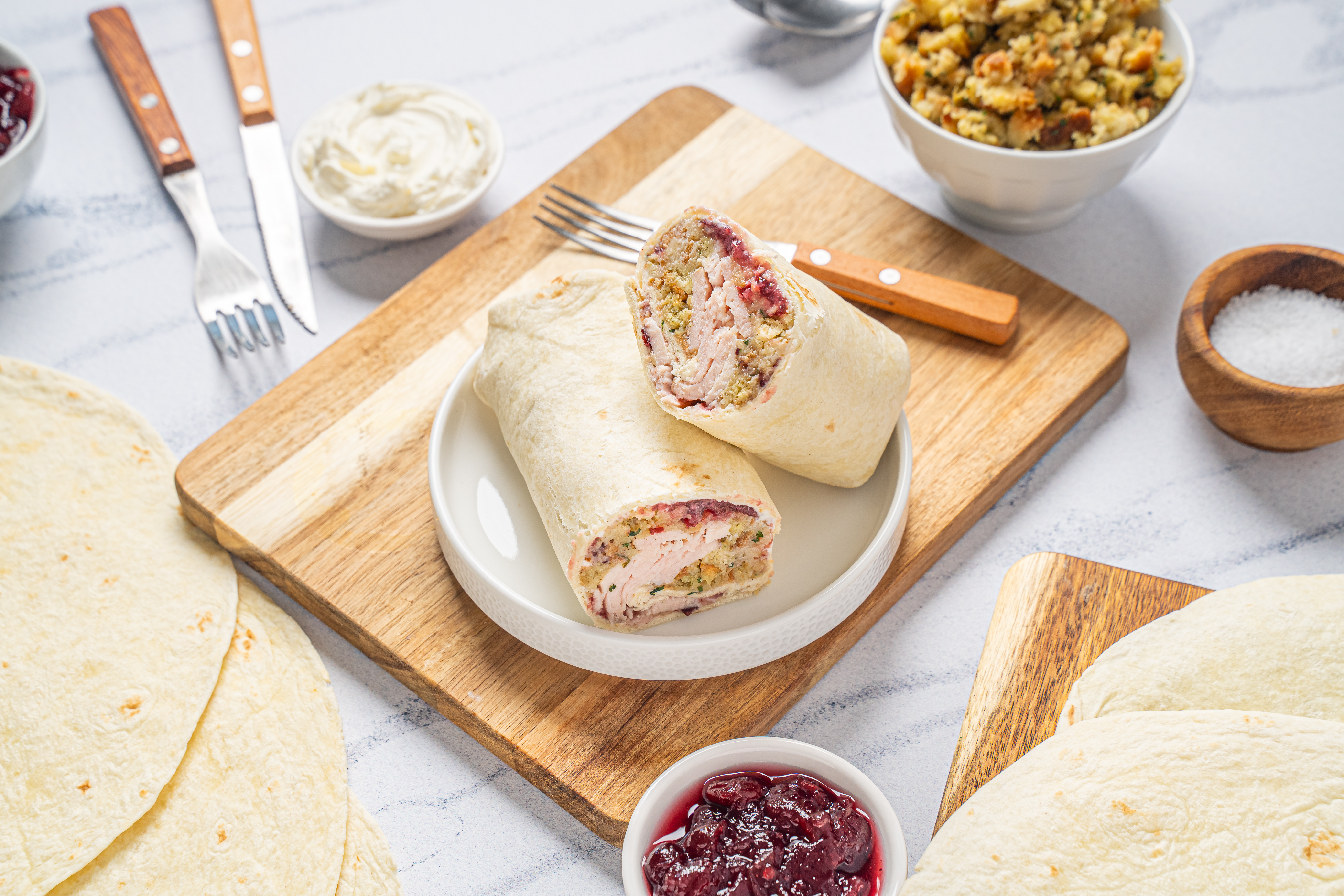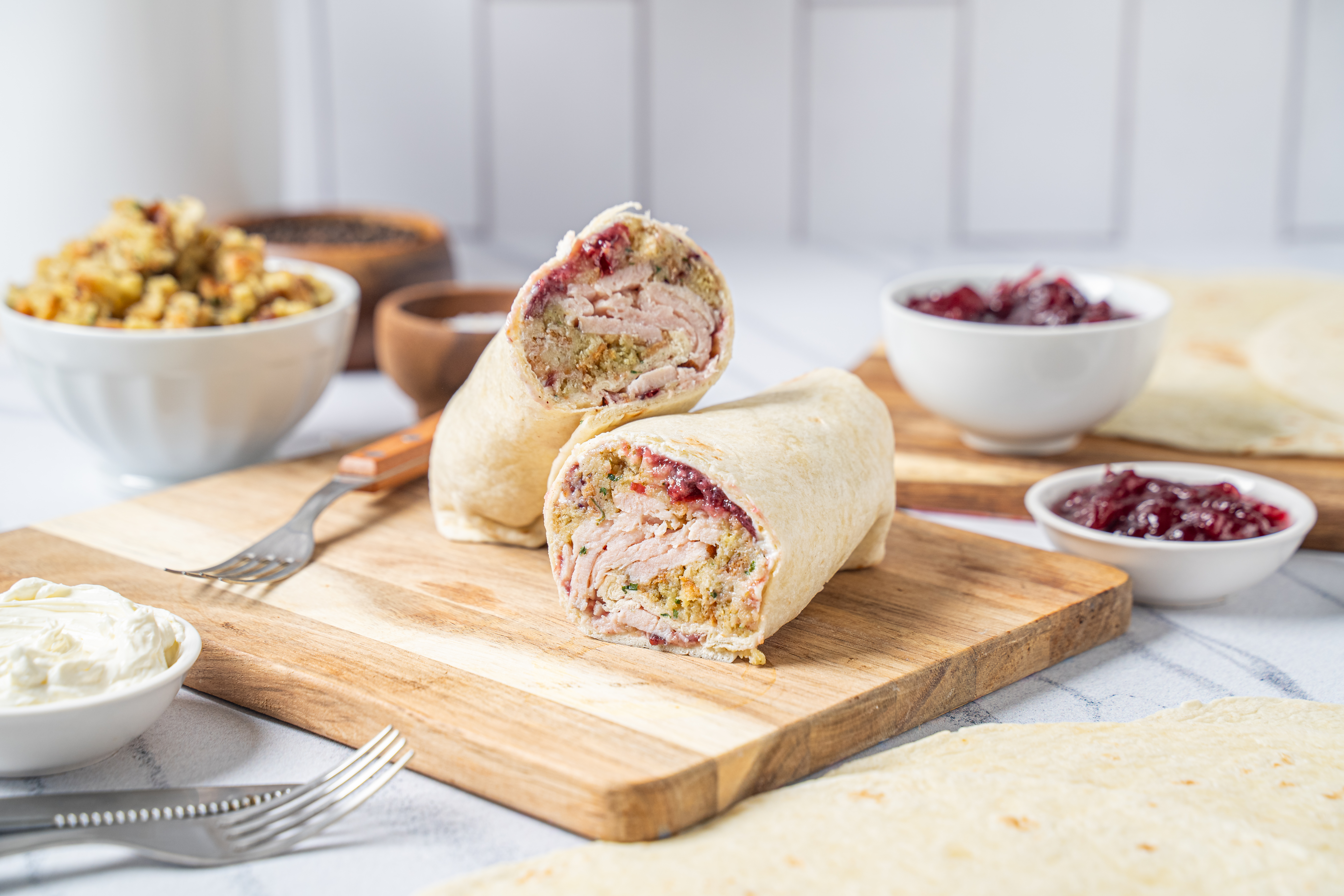 We are all about finding creative ways to use our Thanksgiving leftovers! It's so fun, tasty, and resourceful. This Turkey Day Roll-Up just might be our favorite, though. Sink your teeth into this tortilla that's packed full of your lovely leftovers; tender turkey, fluffy stuffing, and tangy cranberry sauce. There's a bit of rich whipped cream cheese spread around to really bring the flavors together. Perfect for lunch the day after, make a Turkey Day Roll-Up and let the flavors of the holiday live on!