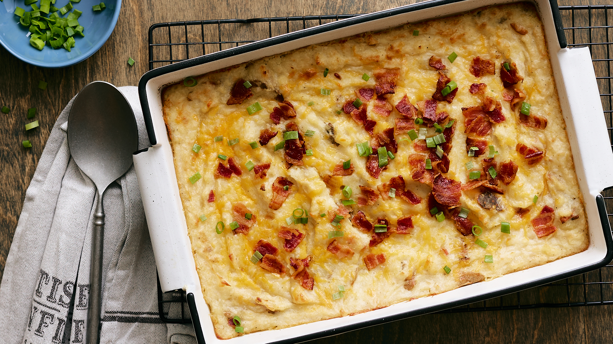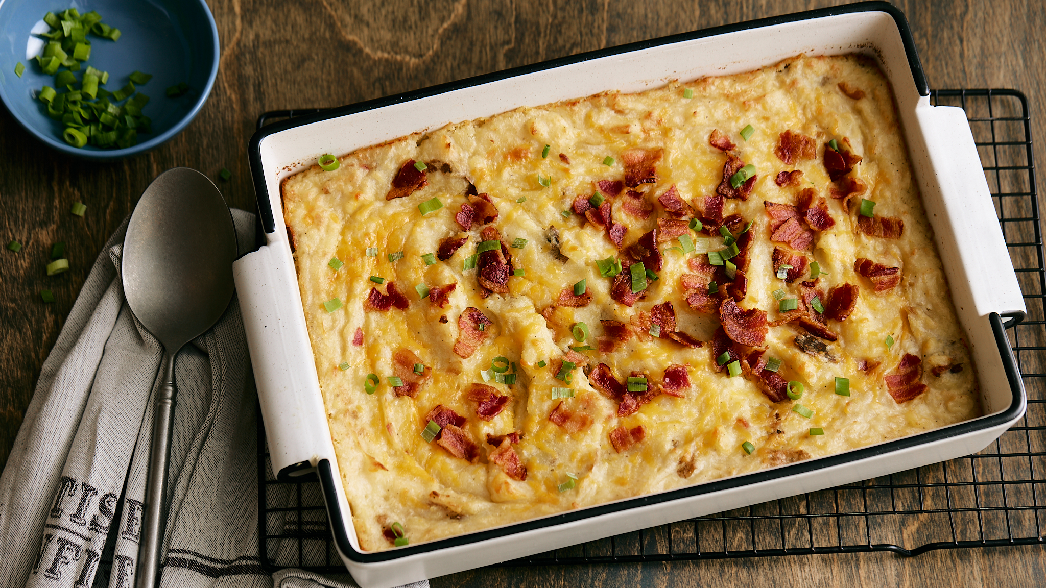 Step 13 -Evenly sprinkle the reserved bacon and the remaining cheddar cheese over the potato mixture.