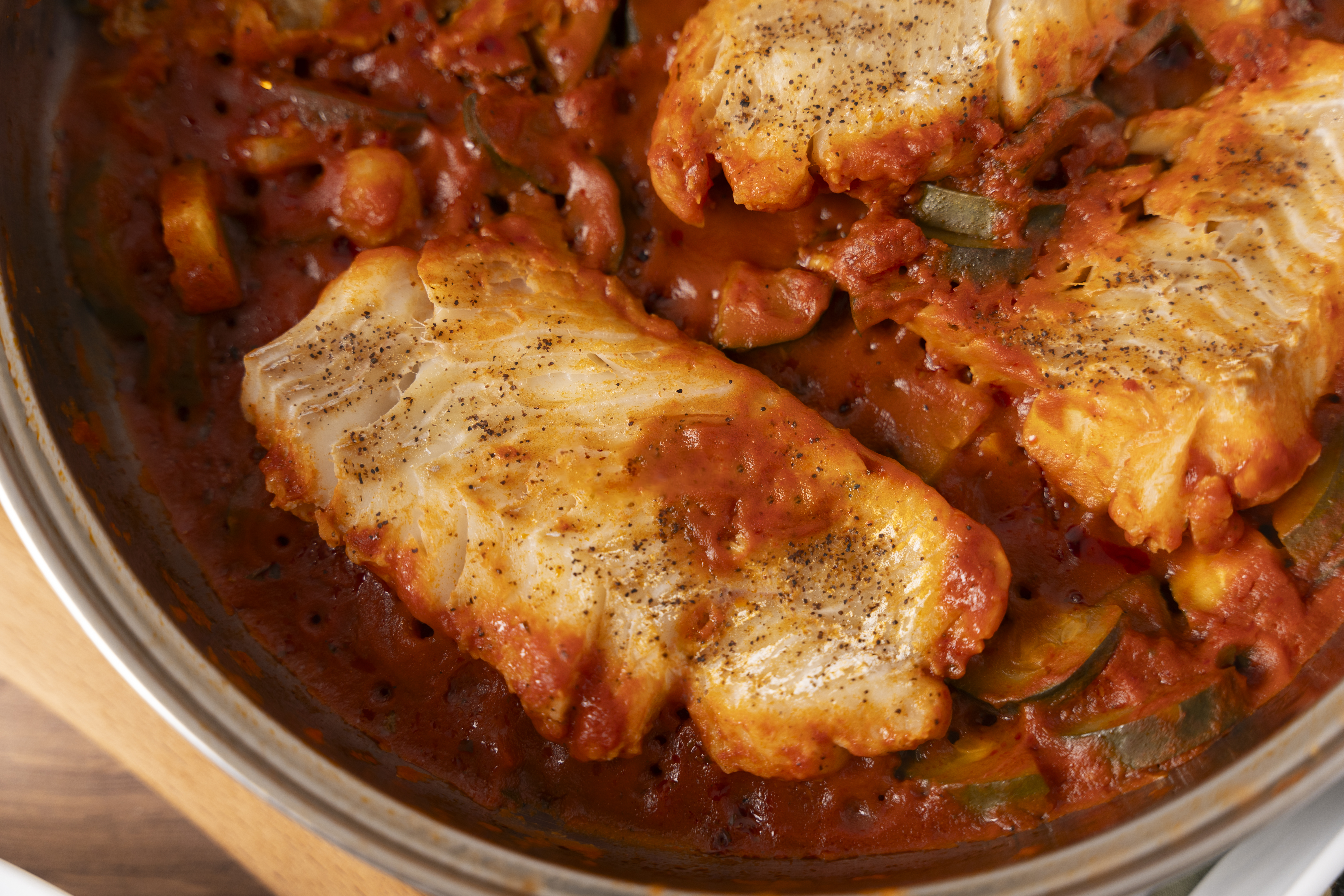 Step 3 -Add the fillets to the sauce, cover the skillet, and cook until the fillets are just opaque throughout and reach an internal temperature of 145 degrees F, about 7 minutes.