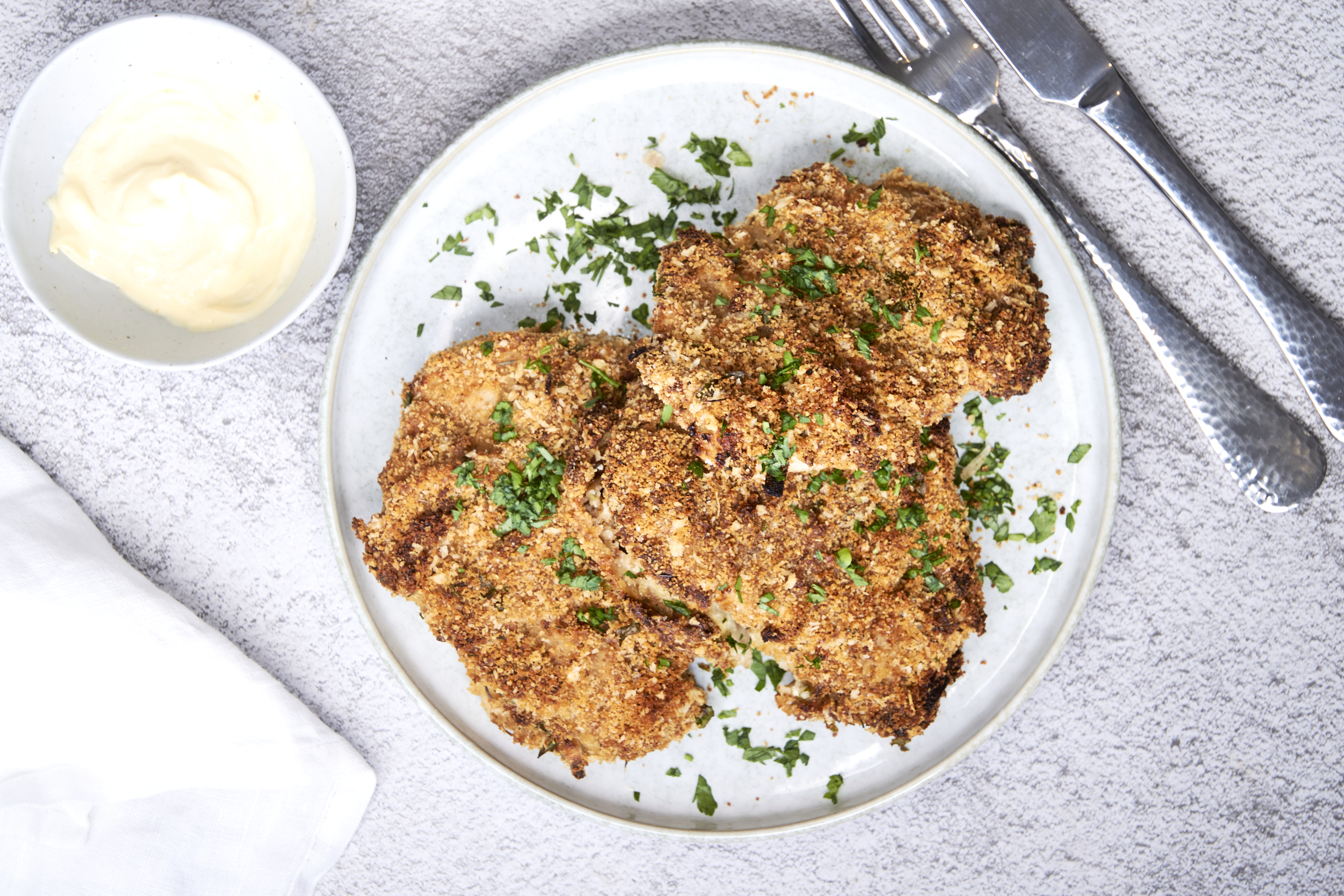 Step 20 -Dredge the flour-coated pork chops in the mayonnaise mixture and let the excess drip off.