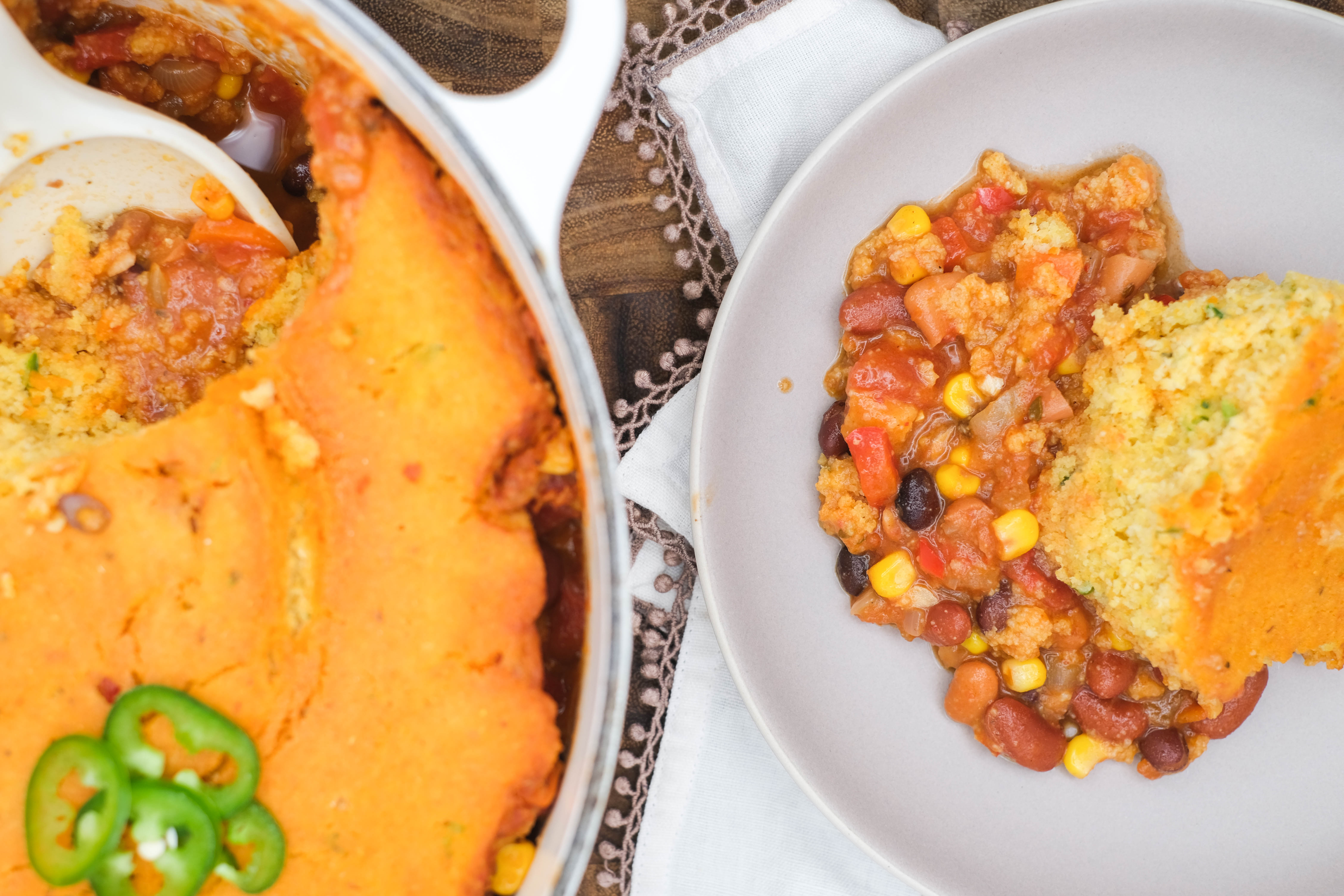 Chili isn't just for meat lovers! And believe it or not, even said meat lovers may also love this Vegetarian Cornbread Casserole! This warm and hearty bake swaps out the traditional bowl for a plate, but keeps all of your favorite things about your chili experience in one dish. Get ready to taste the rich, veggie-filled soup simmering under a golden, moist homemade cornbread crust... it's pure perfection! You won't even realize there's not a single ounce of meat to be found within... and you might never crave that version again. So, the next time you have the hunkering for something comforting and filling, give this Vegetarian Cornbread Casserole a try! It'll be worth it!