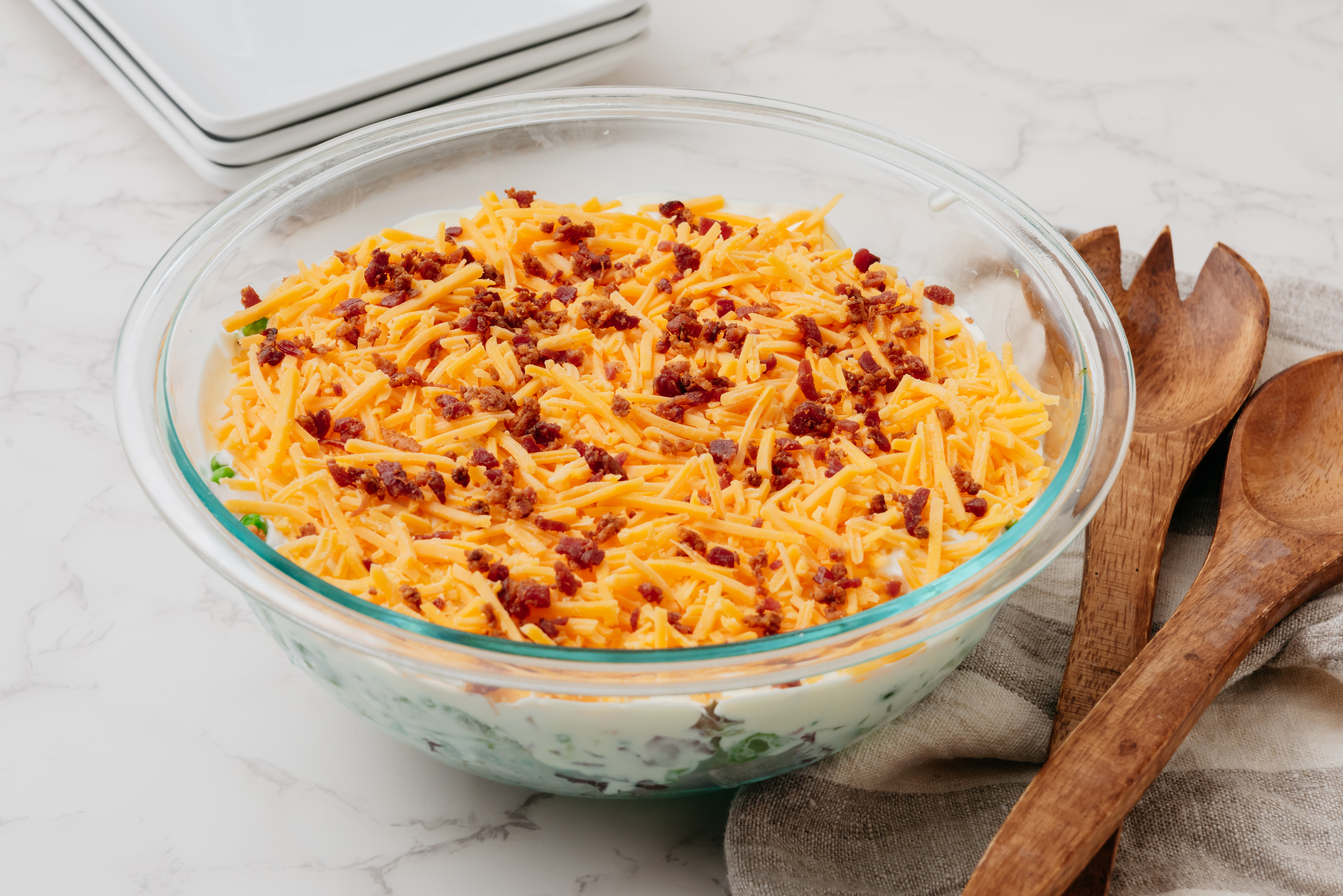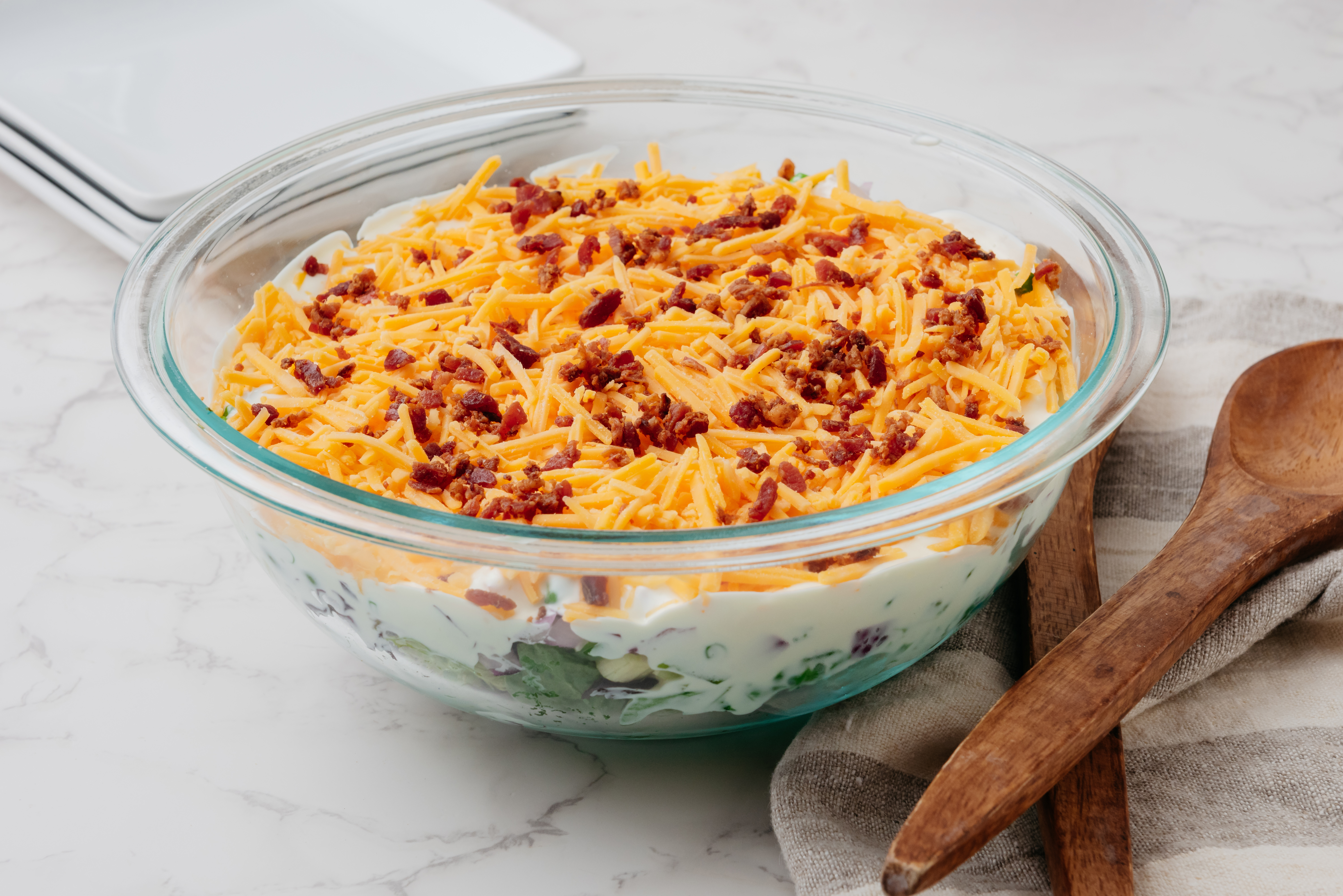 Hold the ants and the flies! This long-in-coming dish HAS to make its debut at your next picnic! Partial to the checkered-tablecloth-life, Worth-The-Wait Salad is getting impatient and just needs to be on the hot-but-not-sweating-it menu at your next social gathering. Fresh-from-the-garden mixed greens are layered and weighed-down-but-loving-it with crunchy celery, pepped-up green peppers, feisty red onions, and sweet green peas, and are sitting tight and right waiting on that tangy-sweet creamy mayo dressing, ageless cheddar cheese, and succulent crumbled bacon to join them for an unforgettable, once-in-a-lifetime, got-to-have-it kind of salad. Worth-The-Wait Salad is quick to make and harder to wait for, but we know that absence makes the heart grow fonder.