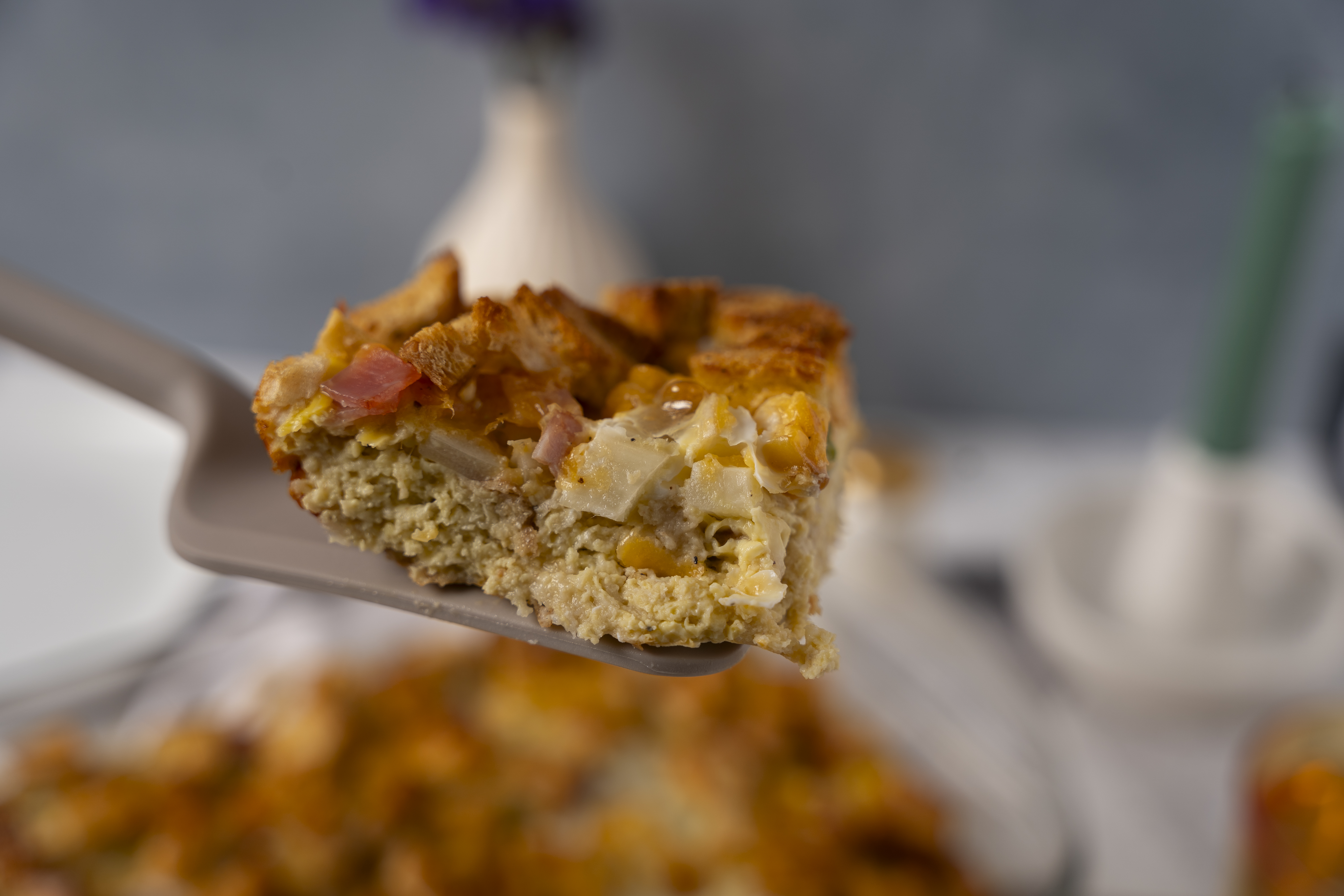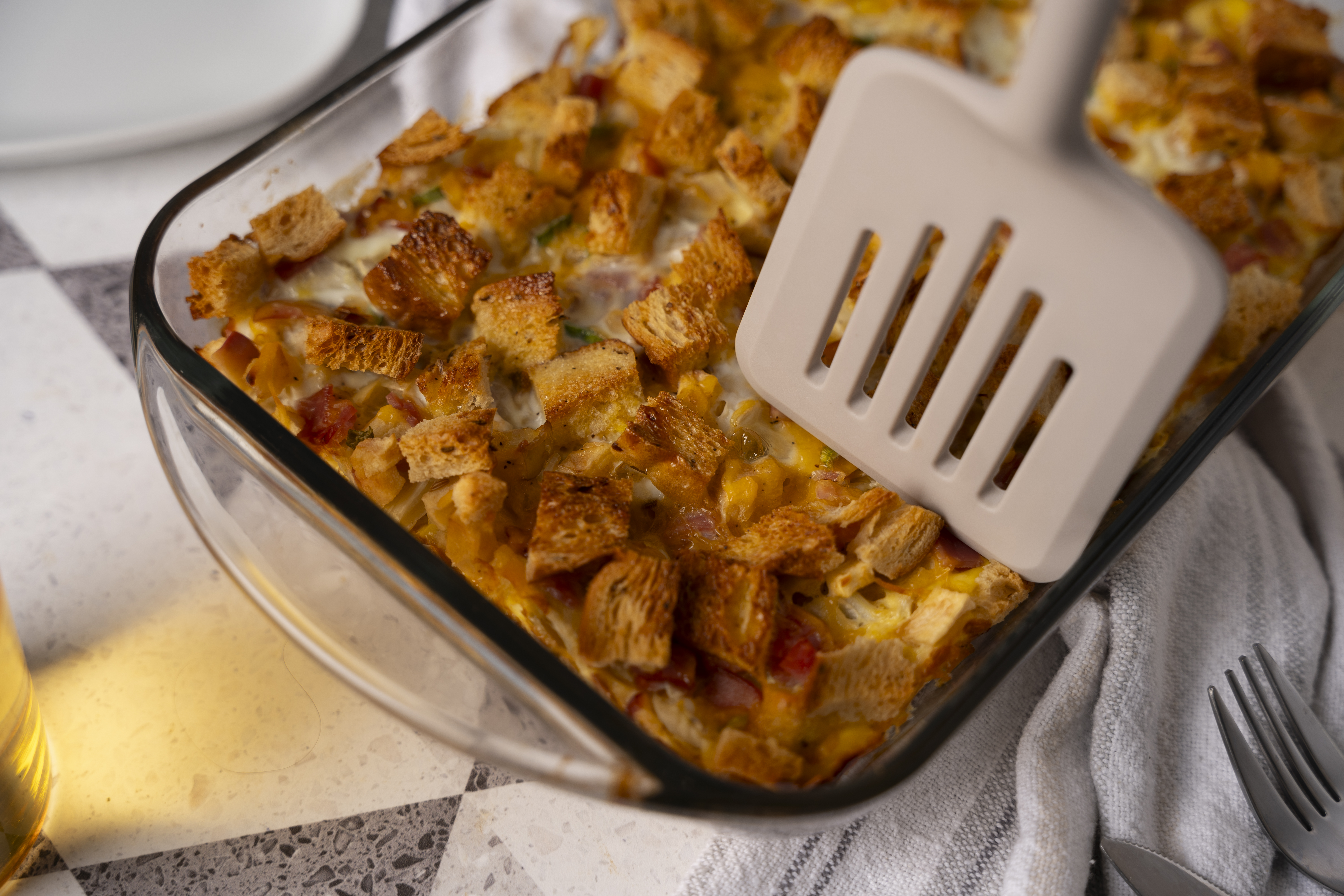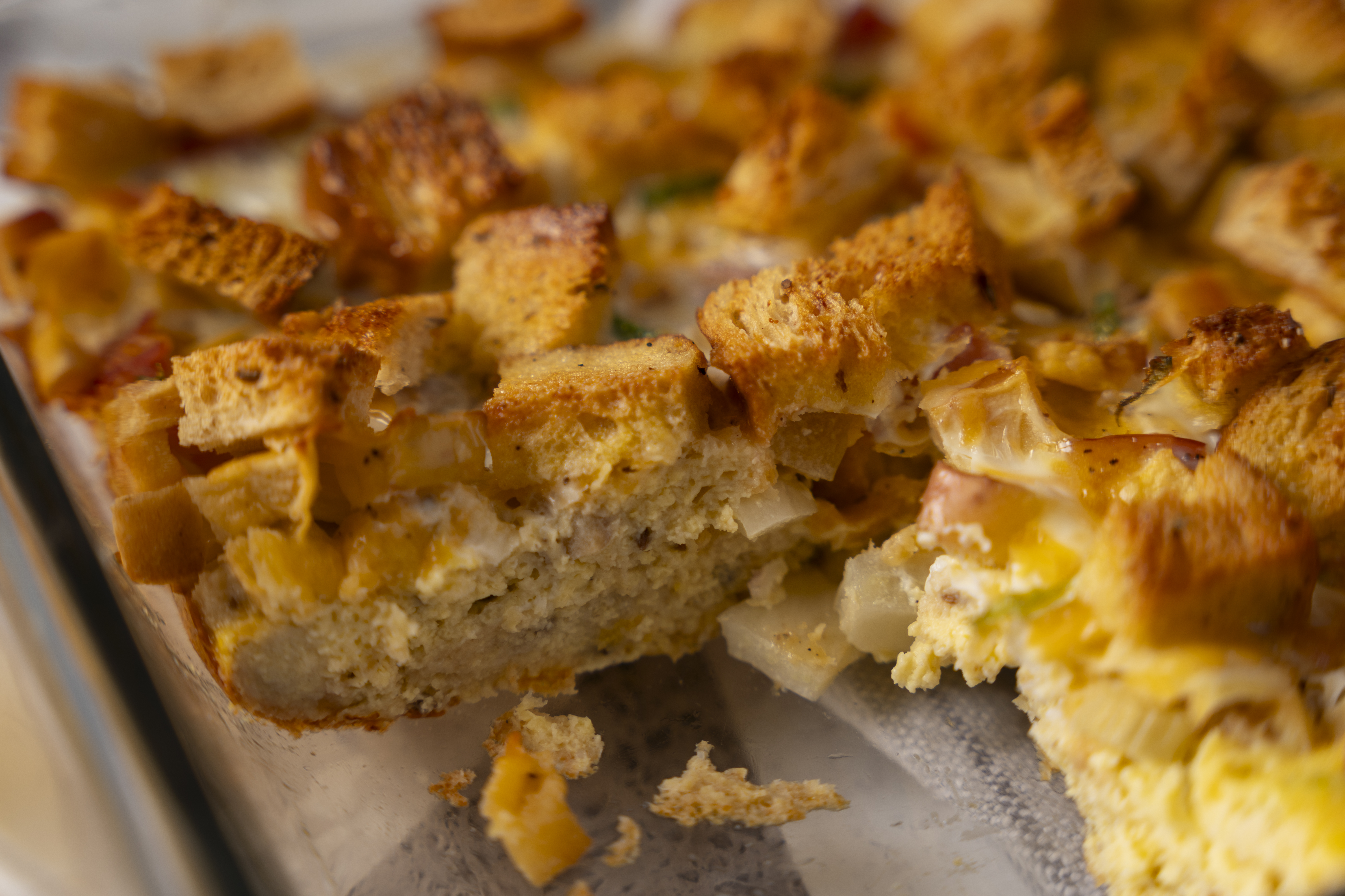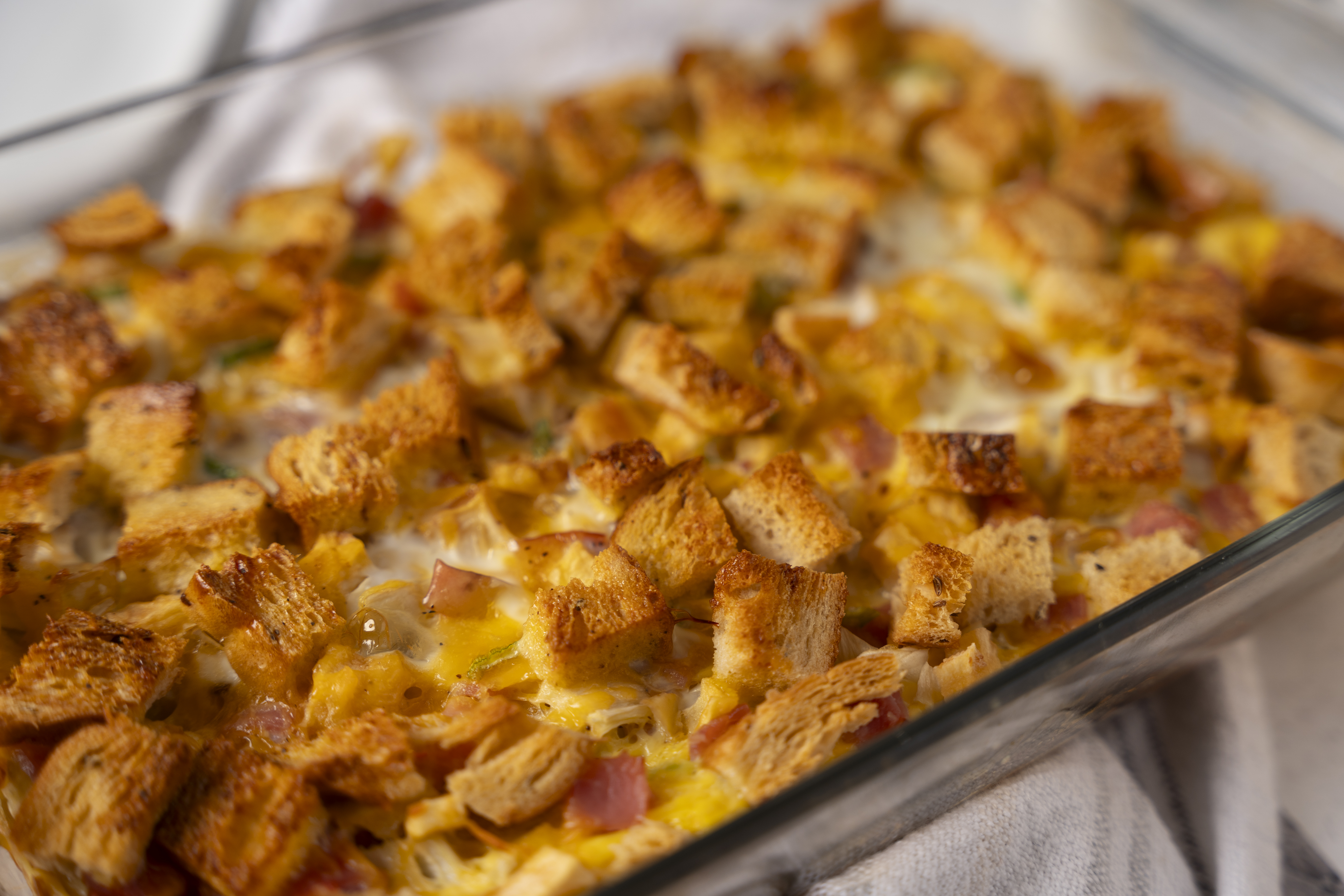 You'll never guess how much you love this breakfast casserole! The You'll-Never-Guess Bake is filled with succulent ham and tangy rye bread cubes in a fluffy bed of eggs, a great breakfast already. But you'll never guess what's included in each bite; fragrant fennel, crisp and juicy apple, and melty cheese. In fact, You'll-Never-Guess Bake has so many flavors going on, it'll keep your taste buds guessing with each bite!