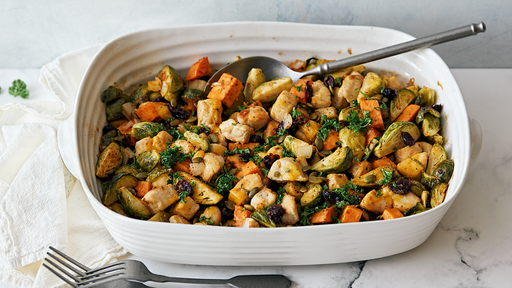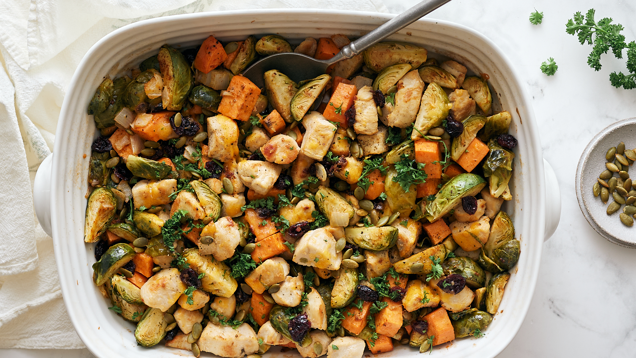 'Tis the season for warm and delicious food! Celebrate in the most delicious way with this Yummy Harvest Chicken Bake. It has pretty much every seasonal veggie you can think of mixed in, plus some juicy chicken, sweet dried cranberries, and melted cheese. It's perfect for when the weather is cooler, you're feeling festive, and you need something hearty and healthy. Get a taste of something cheery with a nice helping of Yummy Harvest Chicken Bake!